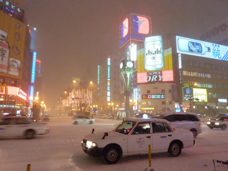 まだ時間も早いので、再びすすきの会場へ。夕方よりは雪はましかな。でも道路は真っ白で、そんな中を車が普通に走っている。北国恐るべしだ。会場に着くと、氷像がライトアップされている。昼間とはまた違った感じで、きれいだな。たくさんの人がこの景色を楽しんでいる。さっきと同様、ぐるっと一通り見て回る。やっぱり写真をたくさん撮りたいのだが、とにかく手が冷たくなるね。でもがんばる。そのうちに、また雪が強くなってきたな。今はきっと-10℃を下回ってるんだろうな。