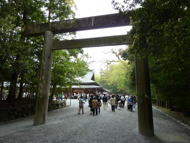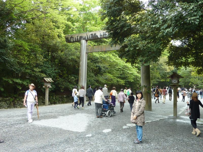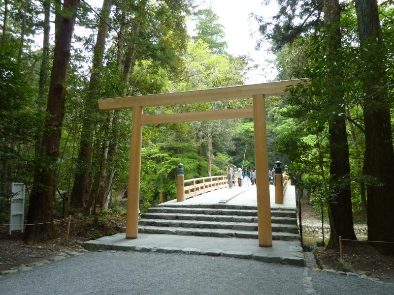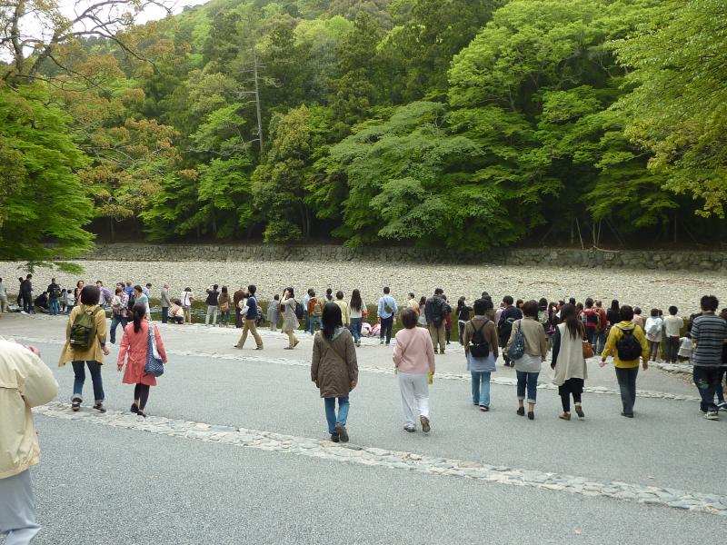 ここからはバスに乗り、10分ちょっとで内宮前まで。途中、駐車場に向かう一般の車は長蛇の列になっていた。これはいつ入れるんだろうな・・・バスでよかった。バスを降り、目の前にあるのが宇治橋。ここが伊勢神宮の表玄関だ。しかし、これはすごい人。よく写真で見るのは、誰もいない静かな橋だが、まあそれは無理としてもそれにしても人多すぎ。やっぱりゴールデンウィークですね。では渡りますか。ここ内宮は皇大神宮と呼ばれ、皇室のご祖神の天照大御神をお祀りする日本で最も尊いお宮と言われている。宇治橋鳥居をくぐり、橋を歩くと上流側に木除け杭がたっている。これは大雨は洪水に時に流木から宇治橋を守るもので、それだけ神聖な橋ということかな。橋を渡ると神苑があり、広い砂利道にはたくさんの人が歩いている。少しはずれて、松が植えられているところを歩くと人が少なくていい感じ。火除橋を渡り、到着した手水場はやっぱり人がたくさんで順番待ちだ。でもしっかりとお清めしましょう。