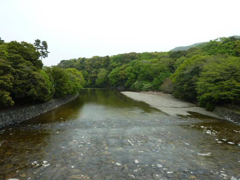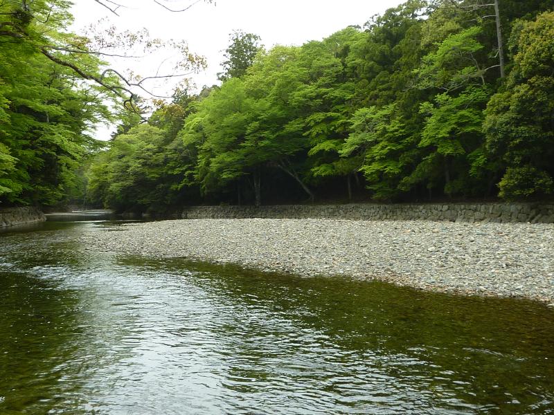 第一鳥居をくぐると、五十鈴川の御手水場がある。宇治橋の所よりは随分と細い流れだな。ここは参拝前に心身を清める場所で、冷たい水が気持ちいい。上流からのさらさらとした流れを見ていると、なんだか気持ちが落ち着いてくる。さあて、では行きますか。