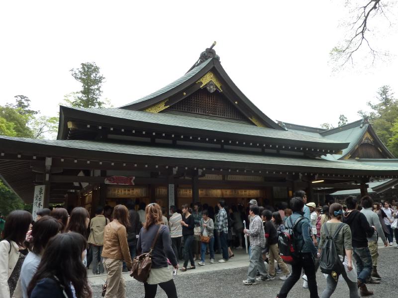 第二鳥居をくぐると、神楽殿がある。お守りやご朱印は、ここで帰りに頂きましょう。参道を先へ進むと徐々に太い杉が目立つようになってくる。人は多いが静かで神社らしい雰囲気だ。そして一番奥の、御正宮前に到着。お参りをするには大階段を上がるのだが・・・黒山の人だかり。まさに階段が人でぎっしりだ。まあここは並ぶしかないので、おとなしく並びましょう。