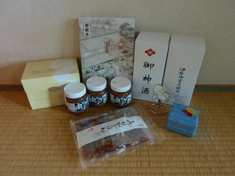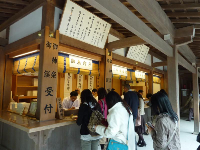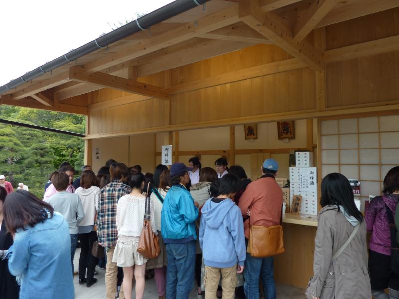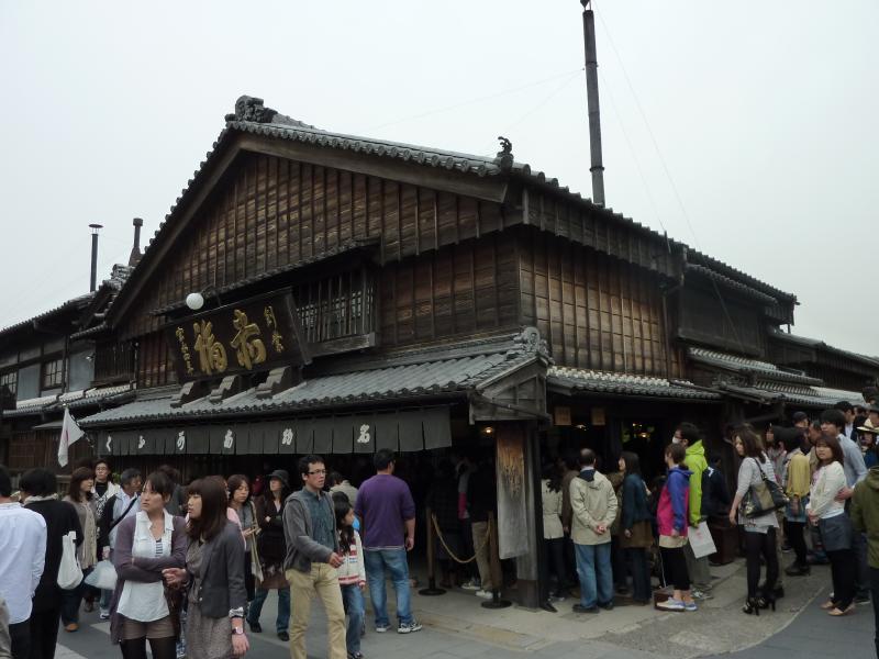 そろそろ行きますか。火除け橋を渡ると御厩がある。外宮では馬がいたが、ここは今はいないようだ。ちょっと残念だな。神苑の中にもお守りやお札をおいてあるのだが、ここで御神酒を発見。神宮記念として、ゲットしましょうか。宇治橋を渡り、これにて内宮巡りが終了。このあとはお楽しみのおはらい町だが、ここがまた異常な混雑。まるで週末の心斎橋を歩いているかのごとくの人混みだ。なんとかお店を見ながら進み、通りの真ん中辺りにあるおかげ横町に到着。