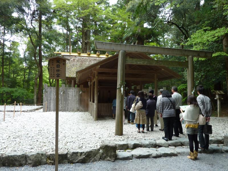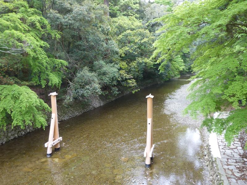 このあとは、もう一つの別宮である風日祈宮へ。新しい鳥居に新しい橋を渡ると、風日祈宮に到着。ここは風の神が祀られており、なんでも元寇の時に神風を吹かせて日本を守った神だとのこと。ここも隣に遷宮の敷地がある。橋は宇治橋よりは小ぶりだが、ちゃんと木除け杭がある。