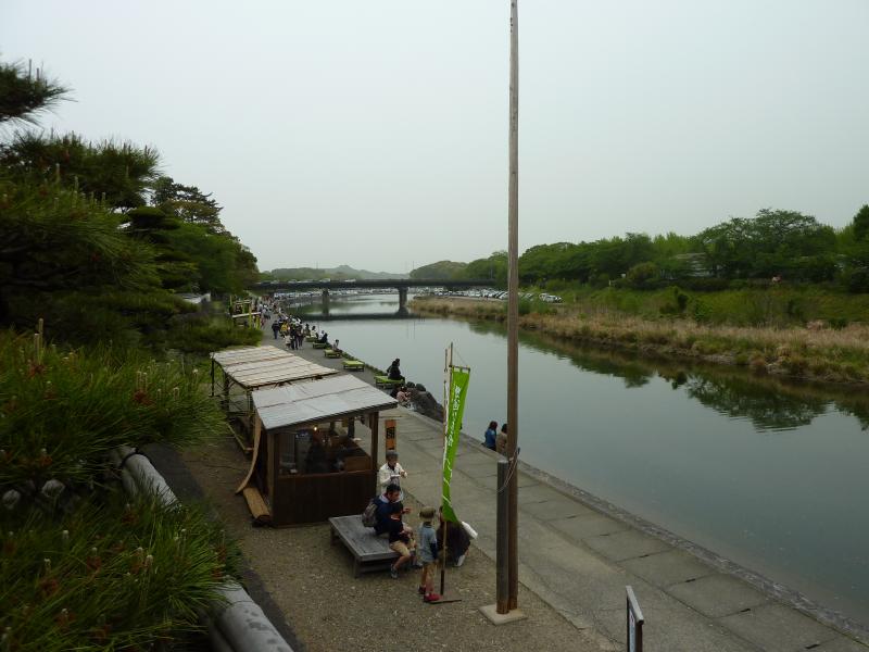 本店からは五十鈴川沿いに出られる。しばらく散策を楽しもう。ここにもちょっとした屋台がでているぞ。緑の毛氈がひかれた椅子で少し休憩だ。さて、そろそろ行きますか。おはらい町の人混みに戻り、お店を見ながら歩く。宇治橋鳥居まで戻ってきたところで、バスにのって五十鈴川駅まで。ちょうど15:59発の特急が来るので、鳥羽駅までは一駅。やっぱり特急は速いなあ。