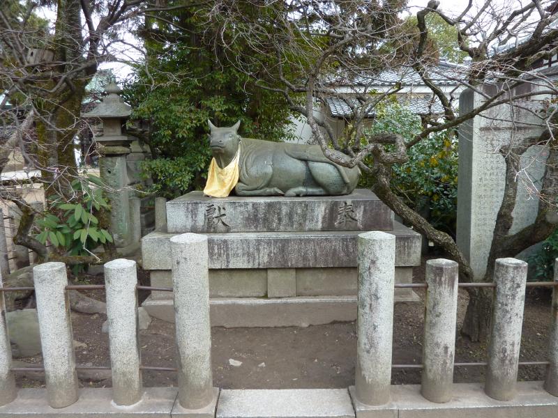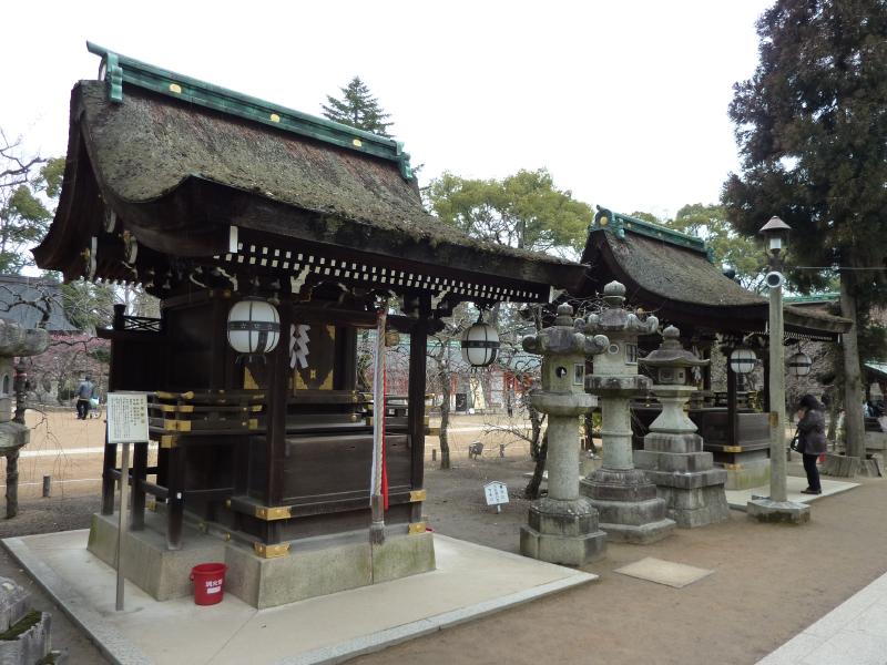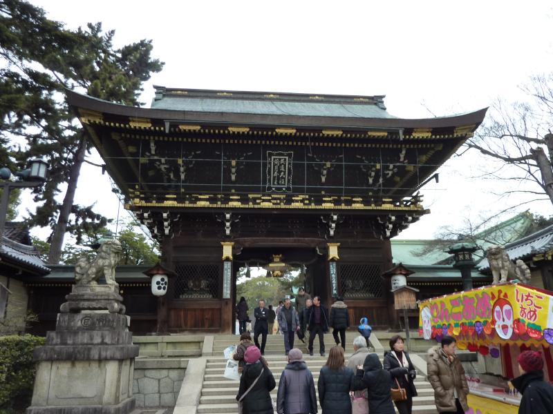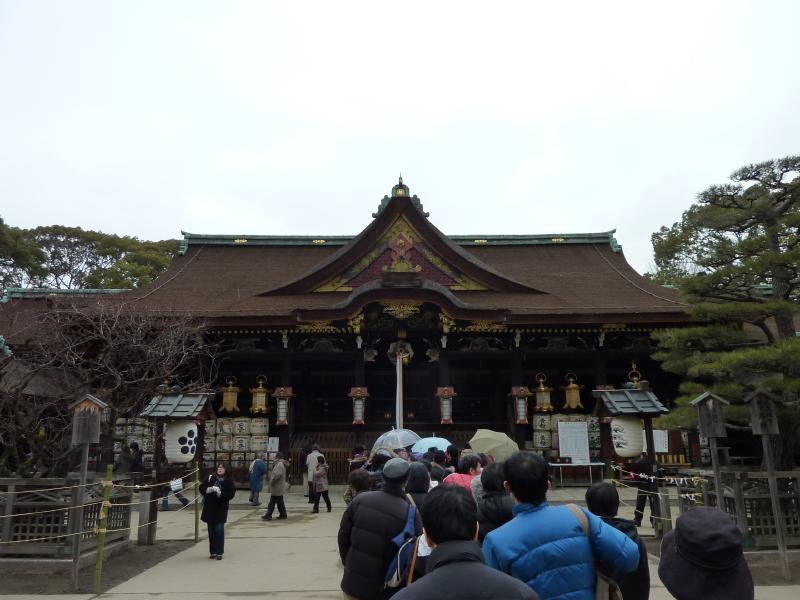 駅前から伸びる通りは今出川通り。ここをまっすぐ行くと母校同志社なんだよね。駅から数分で、北野天満宮に到着。ここは梅と紅葉で有名で、菅原道真公をお祀りした神社だ。ということは学問の神様なので、しっかりとお詣りしておかないと。北野天満宮と言えば、もうひとつ有名なのは秀吉の大茶会。天正年間の1587年に行われたその茶会は、1000人以上もの人が集まったらしい。拝殿には「黄金の茶室」を持ち込んで行われたとのこと、すごい賑やかだったんだろうなあ。 |