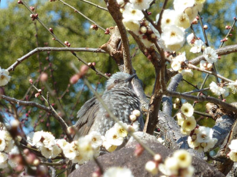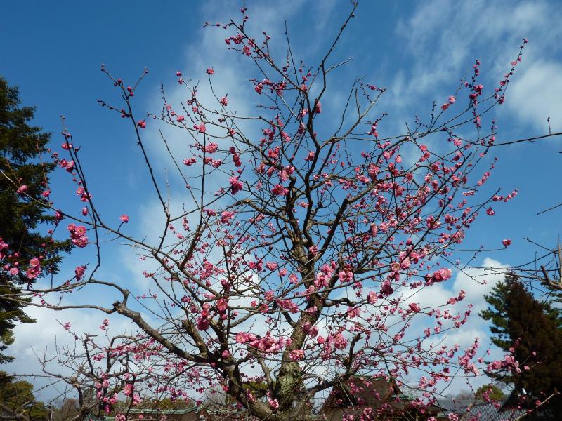 ここ北野天満宮は、そろそろ梅が満開になるころ。白やピンクの梅が、競うように咲いている。まだつぼみのもあるが、今日は青空をバックにきれいな写真が撮れる。よく見ると白梅の陰に鳥がいる。絵になりますね。ここは梅苑も有名なのだが、なんとなく見える中の方はあまり咲いていないかも。まあ今日は梅苑に入らなくても、このあたりで十分。初春の梅を、楽しみました。 |