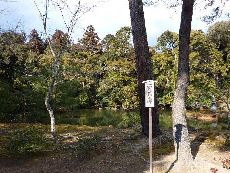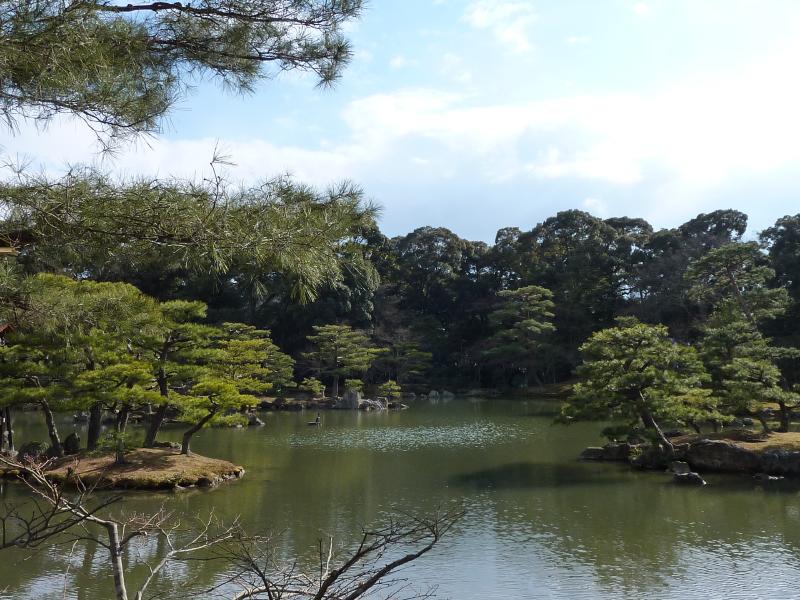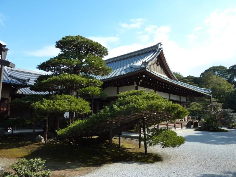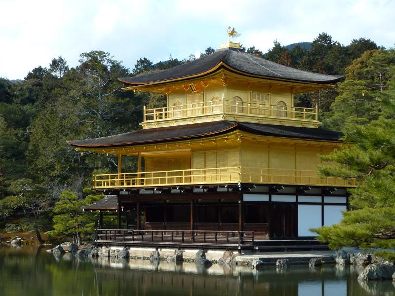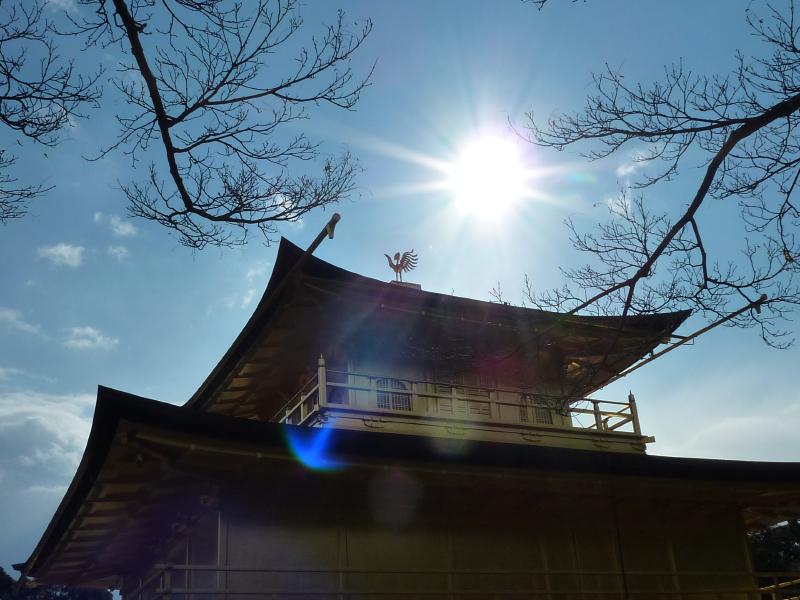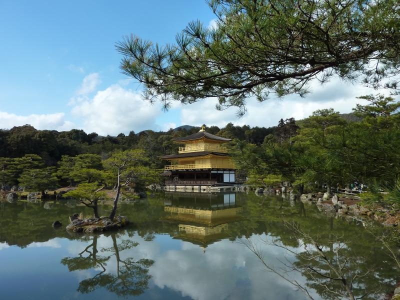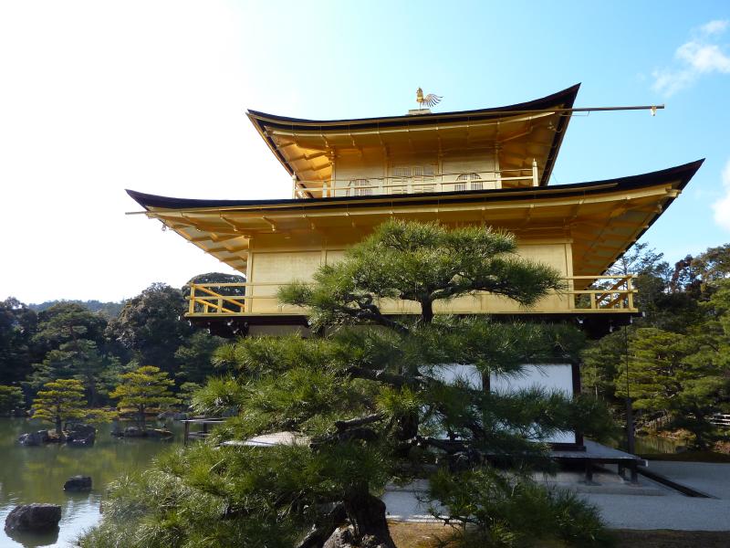 世界遺産・金閣寺。外国の人もたくさん見かける。京都を代表する観光スポットかな。中に入ると池があり、そのほとりに舎利殿が金色に輝いていた。この舎利殿が金閣と呼ばれるのであって、金閣寺とは通称。正式には鹿苑寺といい、足利義満の法名にちなんでいるらしい。1950年に放火により焼失した後、再建や修復を経て今の姿になっているとのこと。昔教科書で習ったが、一層が寝殿造り、二層が武家造り、三層が禅宗仏殿作りだよね。鏡湖池と呼ばれる池と松と金色のコントラストが美しく、やっぱり青空に映えますね。金閣寺の向かいには陸舟の松があり、これは義満手植えと伝えられている。 |