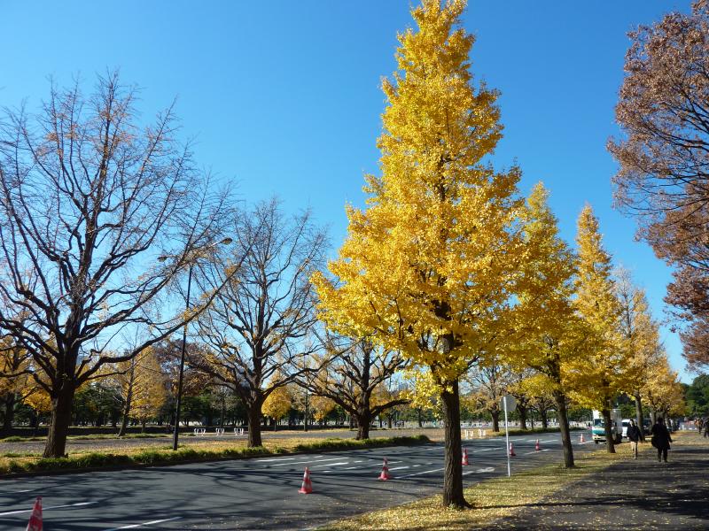 13時をすぎ、お腹が減ってきた。竹橋の辺りに何かお店があるかと思ったが、日曜日ということで毎日新聞の周りも全滅。うーん、なにもないなあ。仕方が無いので散策を再開。北の丸公園の中には科学技術館があるが、確か小学生の時にいとこの家に遊びに行ったときに来た記憶がある。中は何にも覚えていないが、懐かしいぞ。しばらく歩くと武道館。今日は空手の大会があるようで、学生さんがたくさんいるぞ。武道館の前には巨大なイチョウがきれいに紅葉している。さて、田安門からでようか。