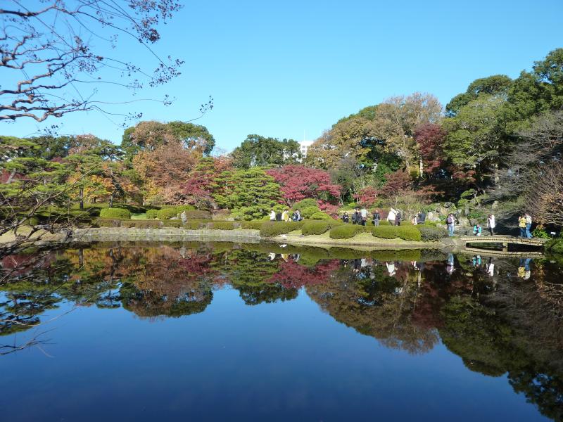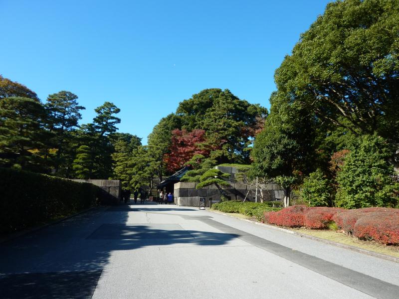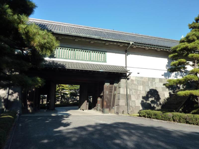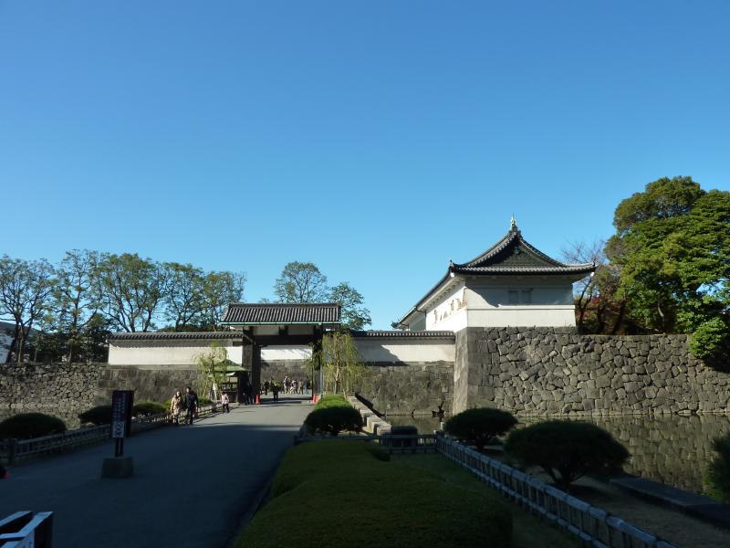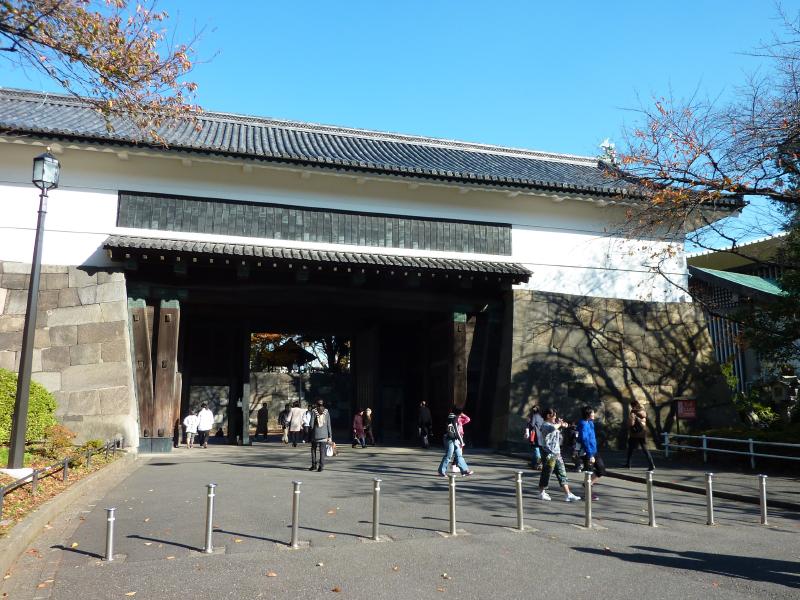 坂を下りるとちょっとした林があり、もう紅葉は終わりだけだが枯れた感じがいいかな。庭園に入るとまずは菖蒲田があり、今は何もない。でも5月くらいになれば、ここにいろんな菖蒲が咲き誇るのかな。そんな景色も見て見たいものです。その奥には池があり、今日は快晴で風もないので、池に映った紅葉がとてもきれいだ。庭園の脇に古民家のような建物があるが、これは吹上御苑にあった昔の茶屋を移転したもの。その隣には椰子の木がある。なんで?と思っていたら、このあたりは都道府県の木エリア。各県の代表的な木が植えられているのだ。大阪やイチョウ、奈良はスギでした。さて、二の丸エリアもこのくらいかな。おなかも減ってきたので、平川門から竹橋方面に出ましょうか。ちなみにここ平川門は、大奥の女中達が通用口として使っていたらしい。若き頃の春日局が、門限を遅れて門の前で一晩過ごしたとのこと。