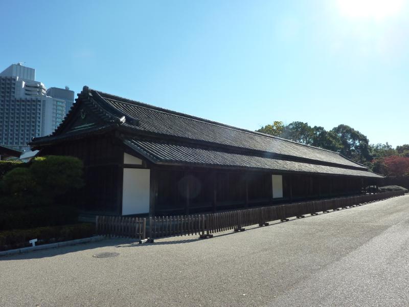 ここから皇居散策を始める。意外と道は広くないので、皇居ランナーの邪魔にならないように歩きましょう。少し歩くと大手門に到着。ここは江戸城の正面玄関で、大名達が参勤交代のときにここから登城したところだという。どんな景色だったのかな。今では皇居東御苑の入口になっている。中に入ると三の丸尚蔵館や休憩所などがあり、その先には同心番所が。要するに守衛室ということかな。ここから少し坂を上がると城壁がある広場にでて、そこには長屋のような建物が。これは百人番所で、たくさんの同心が昼夜問わず警護のために常駐していたらしい。