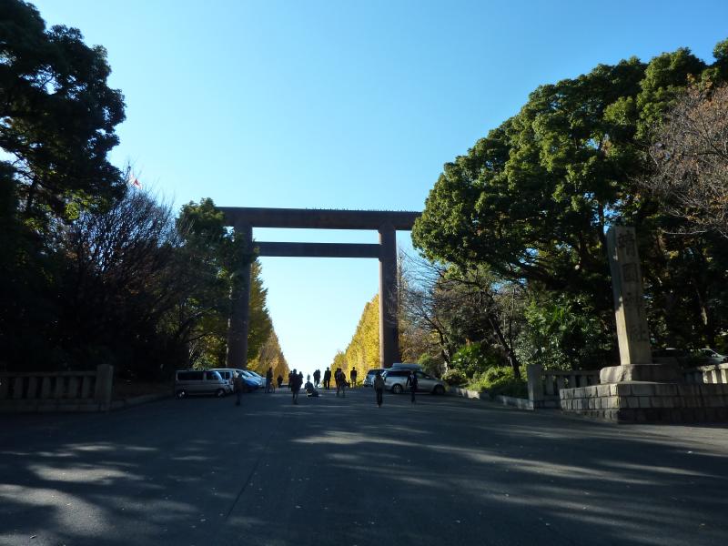 歩道橋を渡ると、靖国神社の参道入口。広い道の向こうに大きな鳥居があり、そこから紅葉したイチョウの並木道が見える。青空との対比がなんとも美しく、神社という独特な空気の中で神聖な気持ちになりますね。鳥居をくぐり、参道を行くと立派な銅像がある。これは近代日本軍の創設者で靖国神社の創建に尽力した大村益次郎の像だ。先へ進もう。第二鳥居の近くには売店や茶店があるので、ようやくここで昼ごはん。かなりの空腹なので天丼を頂きましょう。ちょっと衣多めだが東京風のおいしい天丼でした。ふう、ようやくエネルギー補給完了。第二鳥居をくぐり、大手水舎で手と口を清めて神門へ。