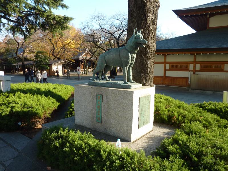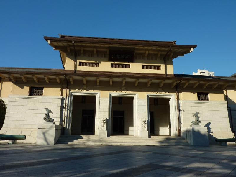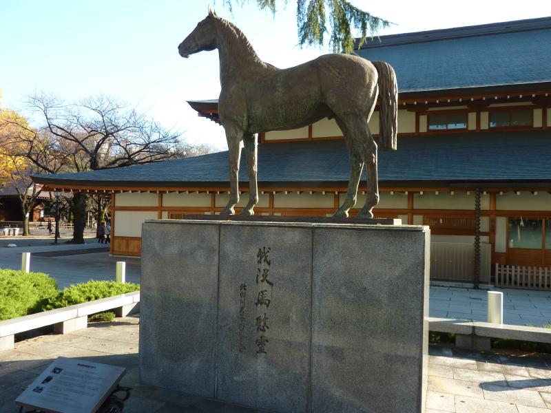 拝殿から右手側にあるのが遊就館。戦争の遺品が数多く展示されている場所だ。今日は時間が無いので入館はできないが、ホールには零戦や大砲などが展示されている。大きな機関車があるが、これはタイとビルマの間に敷設された泰緬鉄道のもの。現在も一部の路線は残っているらしい。また次回、展示物はゆっくり見に来よう。建物の前には戦地で犠牲になった軍犬や軍馬の像がある。今では想像も出来ないような、過酷な現実があったことを考えさせられる。今の平和がそうした犠牲の上に成り立っていること、普段では意識できないことに思いをはせる。
