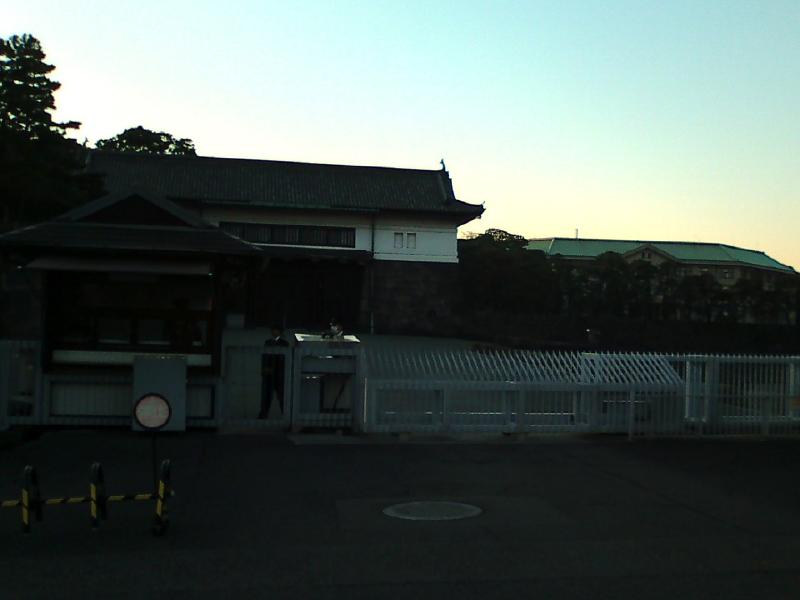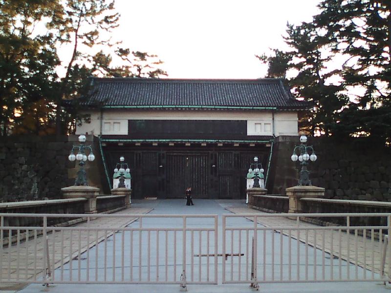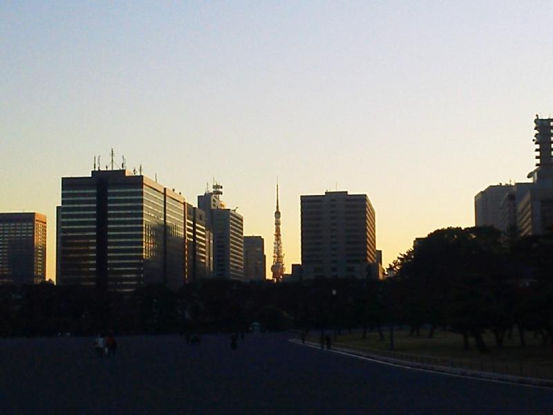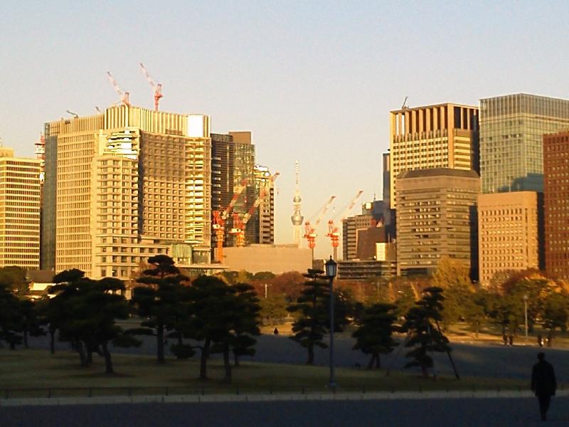 桜田門から入るとそこは皇居外苑。と、ここで残念ながらデジカメ電池切れ。もう少し頑張って欲しかった・・・仕方がないのでここからは携帯で撮ろう。もうそんなに枚数は撮れないので厳選してね。ここで目にするのは、かの有名な二重橋。二連アーチのこの石橋が二重橋と思っていたが、実はこの石橋の奥にある鉄橋、これがかつて木造だったころに上下二段の二重だったことからその名残で二重橋と呼ばれているとのこと。知らなかったなあ。石橋の向こうに見えるのが伏見楼で、これは伏見城から移築されたとのこと。いろんな歴史があるものです。そろそろ暗くなってきたかな。外苑からは遠くにスカイツリーと東京タワーが同時に見える。でもスカイツリー側にはビルが建設中のようなので、近いうちに見えなくなるかも。今だけの景色ですね。