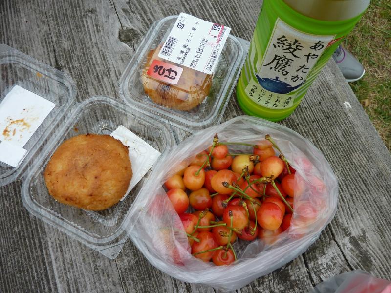 その後はマックスバリューへ。ここでも山形ならではのものをいろいろ見て回る。マックスバリューでごはんにおいしい「だしっ」など、いろいろ買って見る。そろそろお昼ごはんだが、朝たっぷり食べたのでそんなには減っていない。まあでも今日の夜は米沢で牛を食べたいので、軽く食べておきましょう。というわけでマックスバリューで仕入れた味噌おにぎりと、昨日いただいたサクランボを駅前に広がる芝生でいただく。のんびりしてていいな。