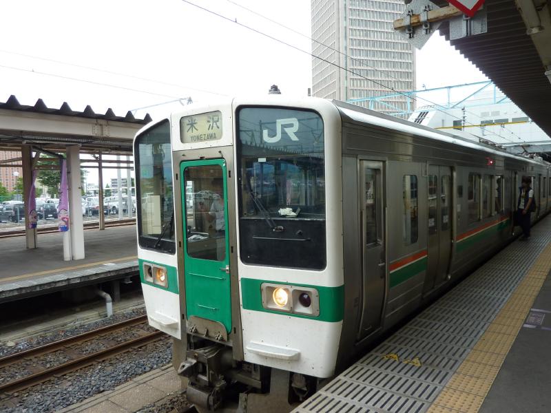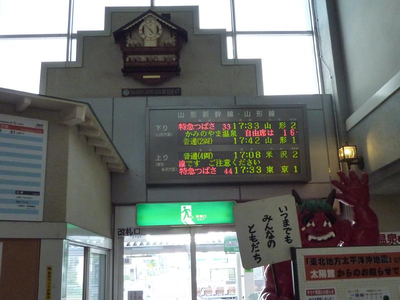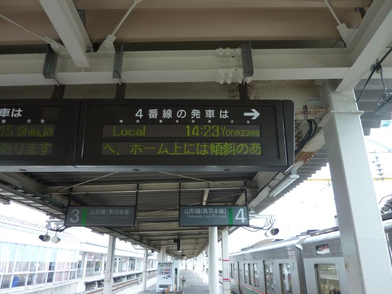 そろそろ行きますか。山形駅からまずは新大阪までの乗車券をゲットする。明日も使えるしね。山形駅14時23分発の米沢行きに乗りましょう。これを逃すと1時間近く待たないと次の電車が来ないのよね。さあ、出発だ。しばらくするとかみのやま温泉を通るのだが、車窓から上山城が見えた。4月はあそこの温泉宿に泊まったんだね。当時は電車が復旧していなかったので山形駅からタクシーで30分くらいかかったが、電車だと随分近いのね。