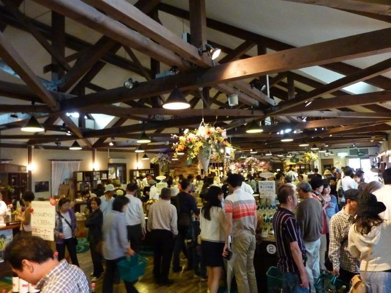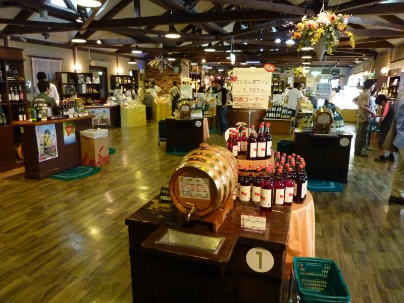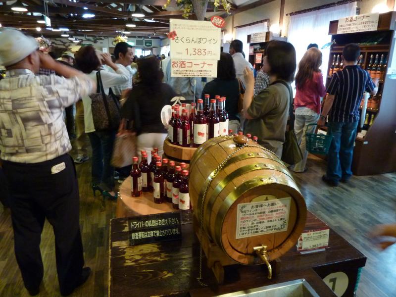 ま、ここはともかく通り過ぎ、奥にあるショップ&試飲エリアへ。するとここは、さっきの観光バスなのかすごい人。たくさんの人が試飲をしているので、われわれも負けずに試飲スタート。自由にいただけるように3つの樽があり、それぞれ「さくらんぼワイン」「最上の朝霧(リースリング)」「樹氷のしずく(シャルドネ)」。さくらんぼは想像通り甘め。リースリング、シャルドネはいずれもさわやかでいいのだが何か足りない感じ。「深み」がないのかな・・・白系は全般的にそうで、他に試飲した「嘉」という泡も、やはり後から炭酸ガスを入れたタイプなのでいま一つ。そうかあ。ただ、4月に山形駅近くで買った「ルオール」というカベルネ&メルローはなかなかおいしかったので、赤系がいいかもね。ということで試飲は出来なかったが、2007年のメルローをゲットしました。やっぱりせっかく来たからには一本くらいはね。あとはおつまみ用のチーズでも買いますか。