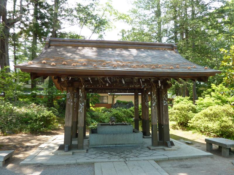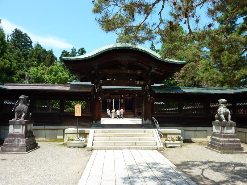 さて、今日は上杉神社へと行こう。ホテルからは途中最上川の清流を見たりしながらぶらぶら歩いて20分ほど、参道に到着。ここは上杉謙信が祀られているのだ。参道そばの石段を登ると、謙信公の遺骸を安置したと言われている御堂の跡がある。一昨年天地人で見たな。石段を下りて石の鳥居をくぐると木の鳥居があり、その先に手水場がある。先月行った伊勢神宮とは違い、人が少ないので落ち着いた気分になったところで拝殿でお参り。