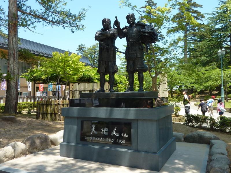拝殿の隣には、宝物殿である稽照殿があるのだが、残念ながら震災の影響で現在閉館中。仕方ないのかな・・・残念だけどね。この上杉神社にはたくさんの像があり、上杉鷹山は江戸時代中期の大名で、「生せは生る 成さねは生らぬ 何事も 生らぬは人の 生さぬ生けり」を詠んだとのこと。天地人の像は、直江兼続と上杉景勝で、まさに大河ドラマの1シーン。そして一番大きくどっしりとしているのが上杉謙信像。やっぱり一番貫禄があるかな。上杉神社、ちょうどいいくらいの大きさで、緑も多くいい神社でした。