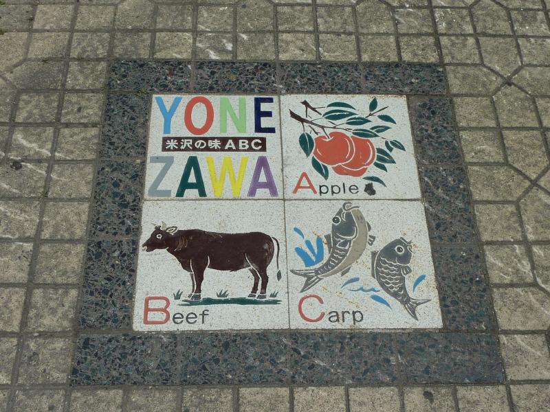 ホテルに戻り、荷物を受け取る。歩いて駅前に着くと、足下に米沢名物ABC(Apple、Beef、Carp)や米沢の祭りを表したタイルが埋め込まれていた。出発前に最後のお土産をゲット。レトルトの米沢牛のビーフシチューなんかもいいかもね。そろそろ時間なので、ホームに入りますか。
