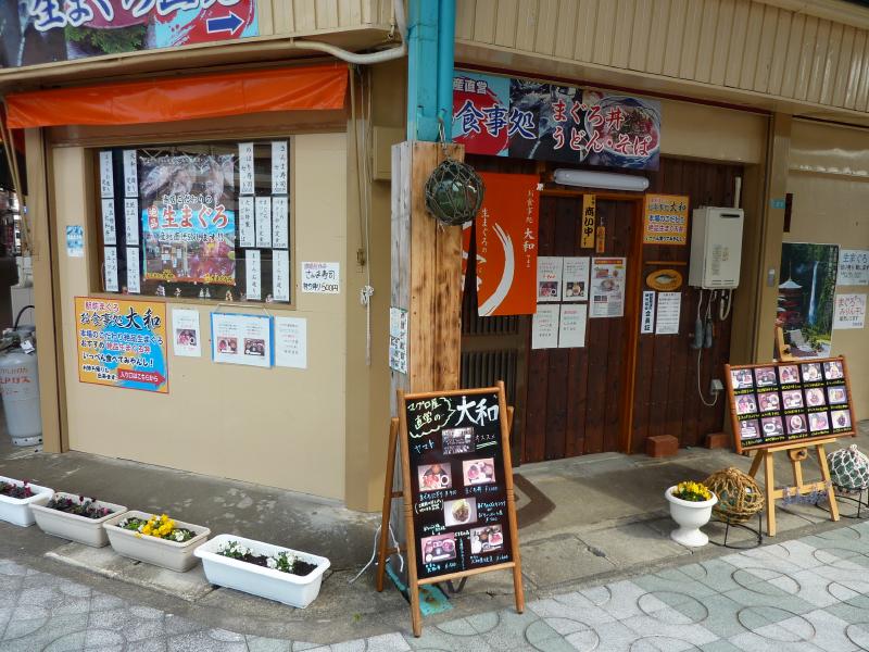 新大阪駅を7:35に出発するオーシャンアローに乗り込む。今日は金曜日、そんなには混んでないですね。駅で買ったおにぎりで腹ごしらえをしながら、天王寺を過ぎて南へと快調に走る。そしていつの間にやら眠りに落ち、気づいたら白浜。随分来たなあと思っていたが、ここから紀伊勝浦まではまだ1時間半ほどかかる。和歌山もでかいです。串本の前後は海沿いすれすれを走るのだが、これは津波が来れば一発だなあ・・・南海沖地震が来ませんように。そして予定通り、11:29に紀伊勝浦に到着。お疲れ様でした。さて、まずは昼ごはん。駅前に大和という店があり、ここの丼が美味しそうだ。早速中に入ると、まだお客さんは誰もいない。ではここの名物という大和丼を頂きましょうか。しばらくして出てきたモノは、まさにマグロ三昧。中トロや大トロ、赤身に中落ちといろんな部位がたっぷりと乗っていて、新鮮な生マグロがとてもうまいです。マグロの角煮と胃袋煮というちょっとした珍味も小鉢で頂き、満足です。いつの間にやらお店は満席、ごちそうさまでした。まずはホテルへと向かう。駅を背にして海に向かって歩き、港沿いにある万清楼が今日の宿。とりあえず荷物を預かってもらい、出かけますか。