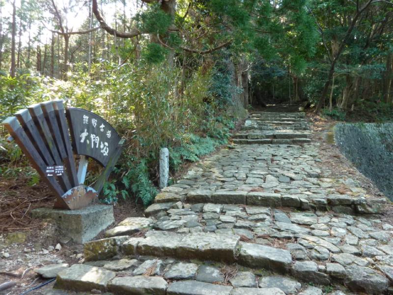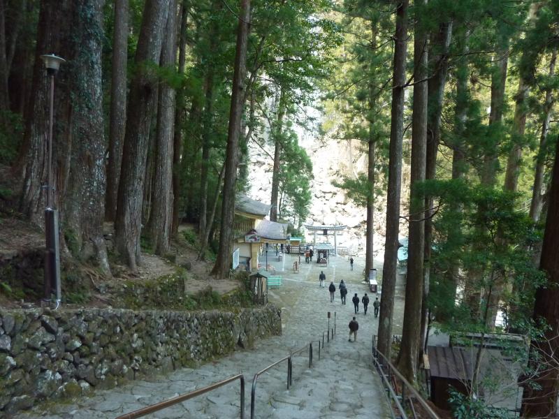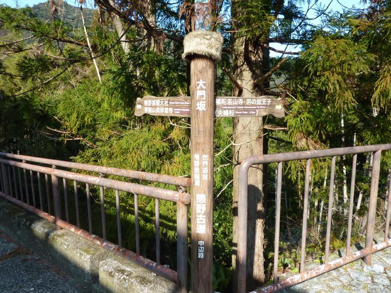 最初の目的地は、熊野那智大社。駅に戻り、しばらくすると那智山行きのバスが到着。早めに乗り込んだから良かったが、あっという間に満員。どこからこんなに人が来たんだろう?13時ちょうどに出発し、途中那智駅に立ち寄り、その後那智川沿いを走ると20分ほどで大門坂駐車場に到着。このまま乗っていれば那智大社に着くのだが、この大門坂を那智大社に向かって歩くのが最も手軽な熊野古道ウォーク。ざっと十数名の人がここで下りたかな。
