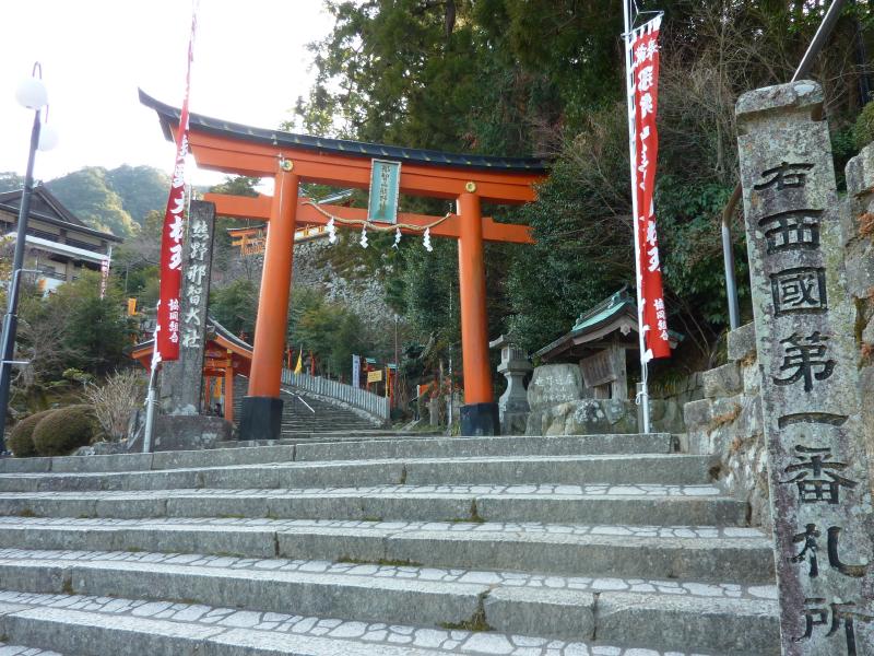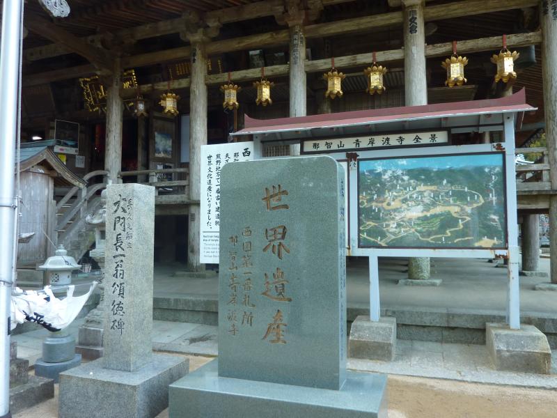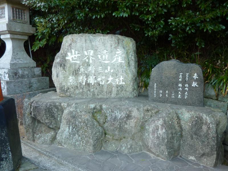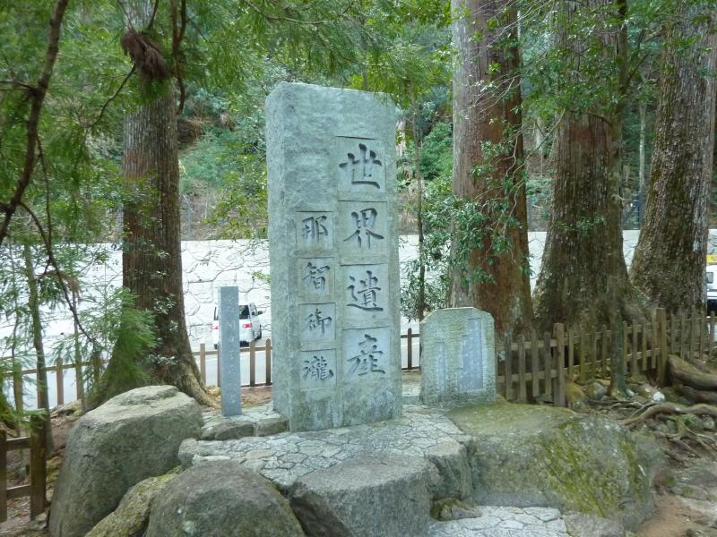 473段の石段を登り切り、那智大社の参道に到着。でもここからもまた階段なんだよね。とにかくこの旅は、足腰が鍛えられる旅になりそうだな。参道を登っていくと朱塗りの鳥居が見えてきた。これが那智大社、一の鳥居。手前には西国三十三カ所巡礼の第一番札所の碑があるが、これは那智大社横にある青岸渡寺のもの。そして鳥居のすぐ横には世界遺産の碑がありました。さて、ここからまた石段を登っていきますか。