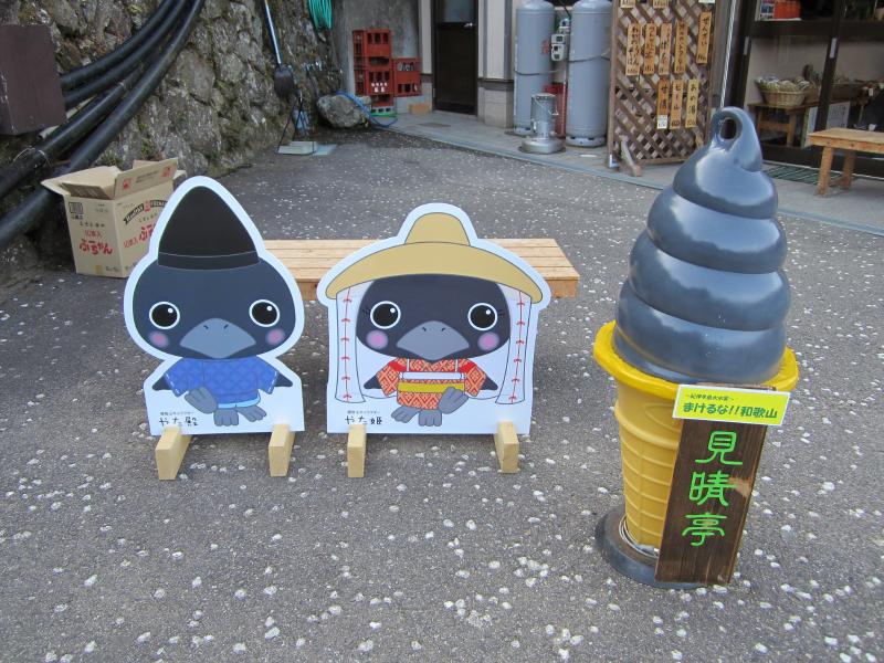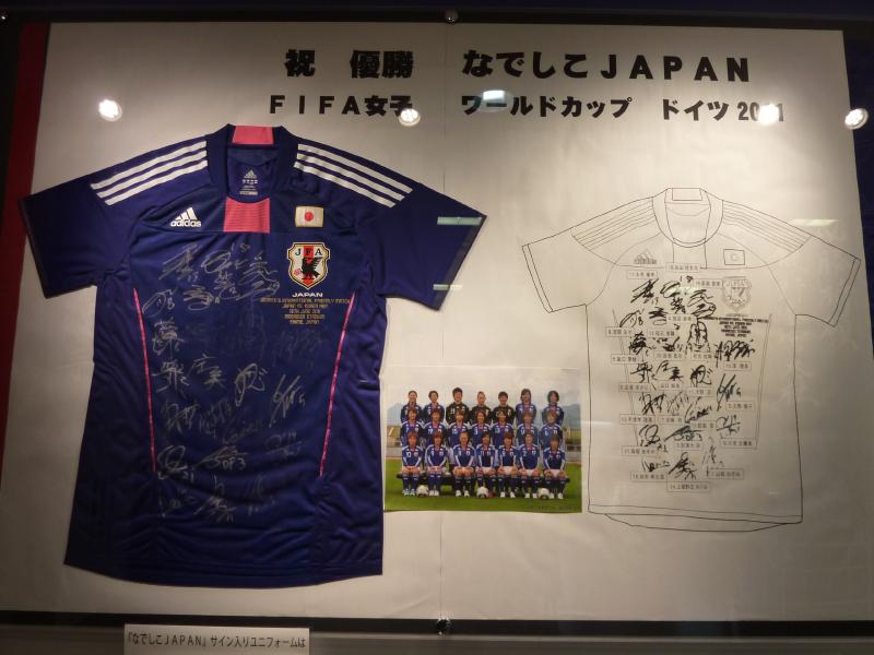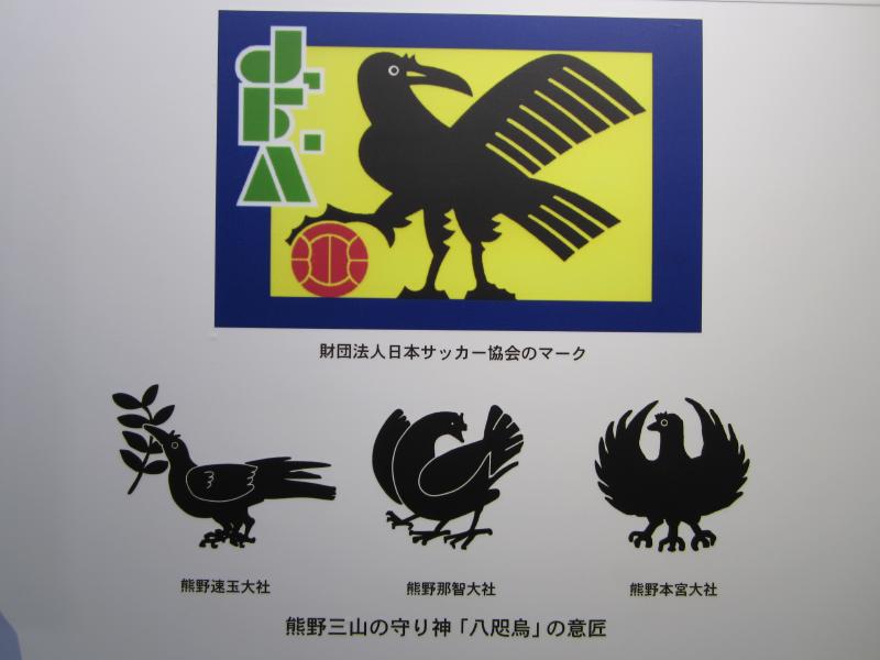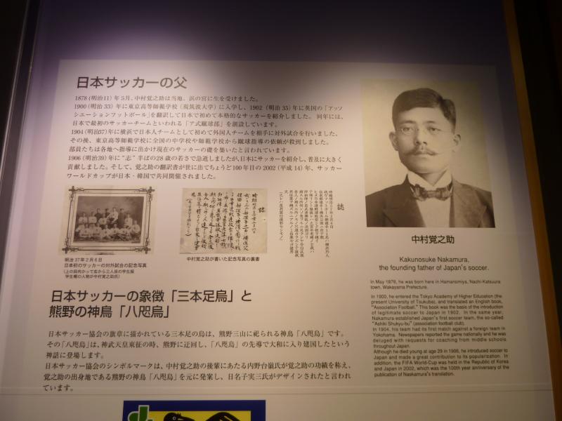 そろそろ行きますか。滝の入口前でいくつかお土産を見ながら、しばしバスを待つ。那智黒石でできたクジラを記念に買いましょう。陽が傾き、ちょっと寒くなってきたかな。しばらくしてバスが到着し、出発だ。さっき下りた大門坂の前を通り、那智駅に到着。ちょっとここで途中下車だ。駅前には日本サッカーの始祖、中村覚之助氏の顕彰碑がある。この人はなんでも日本に本格的なサッカーを紹介した人で、この方が那智勝浦出身だったことから八咫烏がシンボルになっているらしい。では八咫烏とは?これは日本書紀に、神武天皇が熊野越えを行う際に道に迷い、その際天照大神の遣いとして八咫烏が道案内をしたらしい。なので「勝利を導く」という意味もあって日本代表のシンボルになっているのだ。駅のそばにある道の駅の中にちょっととしたサッカーコーナーがあり、なんとそこにはなでしこのサイン入りのユニフォームが飾られていた。優勝祈願や優勝報告をここ熊野で行ったらしく、やっぱりこの熊野の地は八咫烏つながりで日本サッカーの重要な場所なんだね。男子のワールドカップでのサインボールが3大会分飾ってありました。