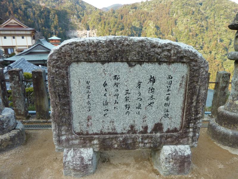 本堂から少し歩くと、遠くに三重の塔と那智の大瀧が見えてきた。ここには花山天皇が出家後に詠んだという「補陀洛や 岸打つ波は 三熊野の 那智のお山に ひびく滝津瀬」とのご詠歌の碑がありました。三重の塔の近くまで歩いてきたぞ。大瀧をバックにしたこの景色は、まさに日本的な絶景にふさわしい。では大瀧まで行きますか。