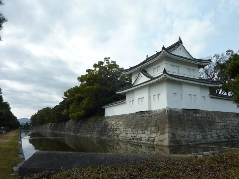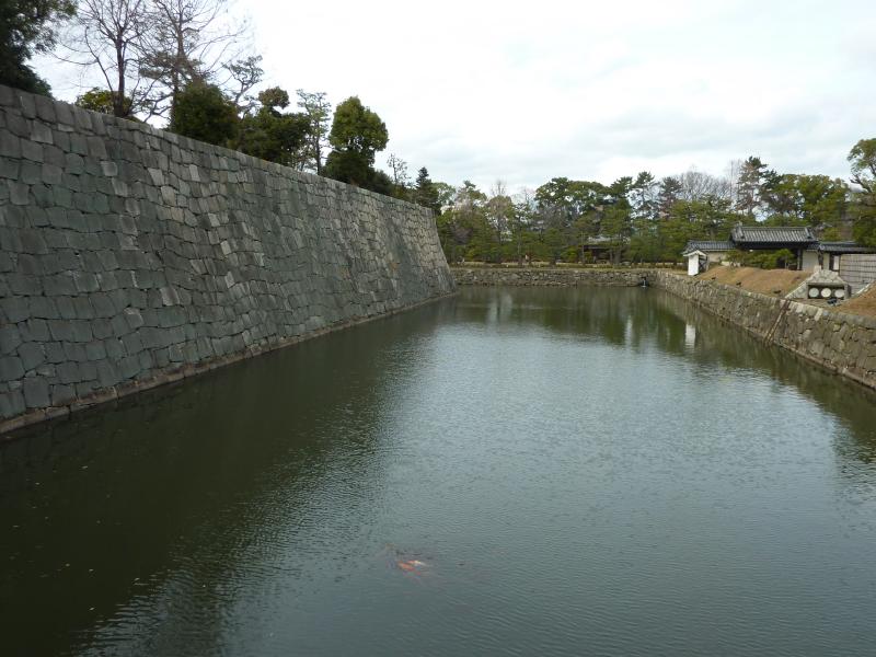 御殿を出て、二の丸庭園へ。御殿のそばに池があるのだが、観る場所によって雰囲気が変わるように作られているらしい。特に大広間から観ると庭園ごしに天守閣が見えたらしく、そんな景色も見て見たかったなあ。ここは特に家光の頃、後水尾天皇が行幸されるとのことで池の中にも御亭が建てられるなど、華やかな庭園だったらしい。現在では日本らしい雰囲気の美しい庭園になっています。さて、庭園を出ますか。向かいには堀があり、東橋を渡るとそこは本丸櫓門。