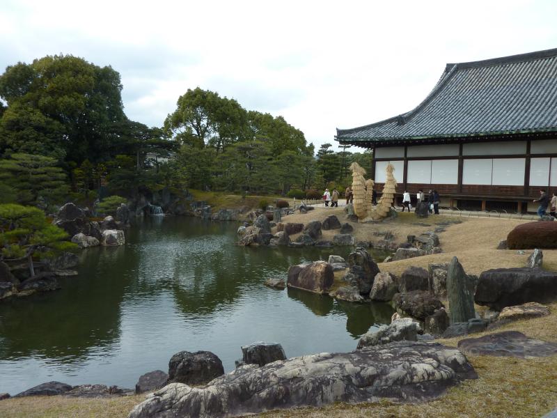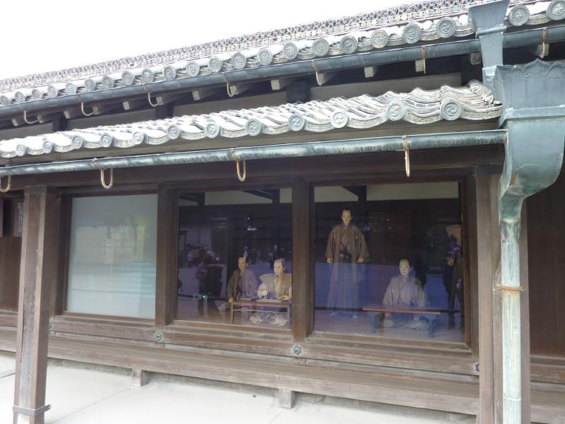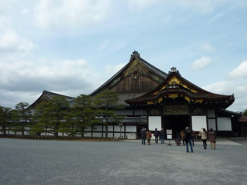 では二条城へと行こう。四条烏丸から二条城までは、地下鉄ならば一駅乗って乗り換えて一駅。うーん、健康のためにも歩きますか。四条通りを西に歩き、堀川通りを北へ進む。堀川通りは道が広くて歩きやすいな。さあて、二条城に到着だ。京都の大学に通いながら、一度も来たことのない二条城、京都の真ん中にこういう城があったことすら知らなかった。でもここが家康の頃に築城され、大政奉還の舞台となり、そして現在では世界遺産となっている。外国人の観光客も多いようだ。城に入り、少し行くと二の丸御殿。武家風書院造りの御殿建築で、中はたくさんの部屋があり、その中の大広間一の間があの大政奉還が十五代慶喜によって発表された場所。松が描かれた金色のふすまが美しい。その奥にある将軍の居間は水墨画だ。うぐいす張りの廊下をぐるぐると歩き、33部屋・800畳分を一周。写真が撮れないのが残念だが、じっくりと楽しめました。