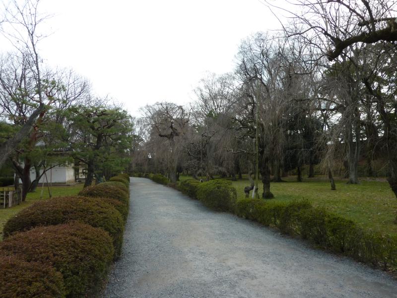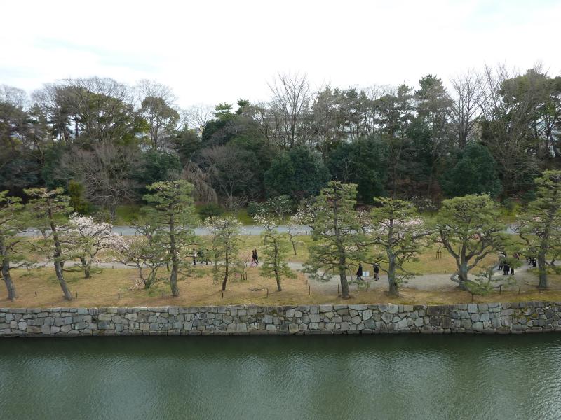 本丸庭園に入る。ここの西南角には天守閣跡がある。家光の頃に増築され、五層の天守閣が聳えていたらしいが落雷による火災で焼失。その後本丸も、火災により燃えてしまったとのこと。なので今ここにある建物は、京都御苑にあった旧桂宮御殿を移したものらしい。当時はさぞ立派な景色だったんだろうなあ。天守閣跡に登ると本丸庭園全体が見渡せ、堀の向こうには梅林が見える。このあとあそこに行くわけですね。石垣の間を抜けて本丸を出ると梅林につながる道があるのだが、ここの木は桜ですね。あと半月もしたら、ここは桜で満開になるのかな。