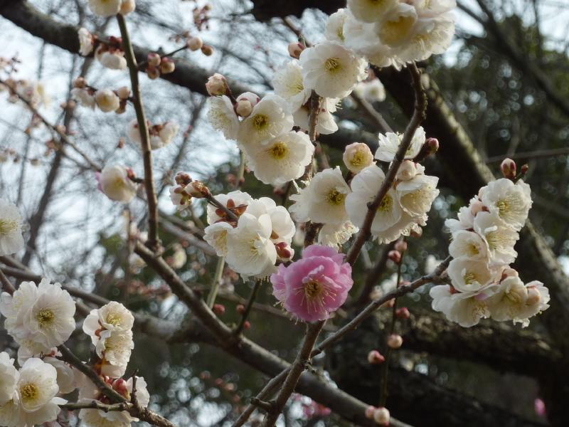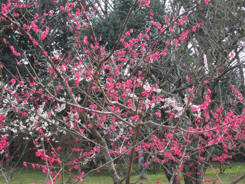 梅林に到着。ほぼ満開といったところかな。白梅や桃梅、紅梅などいろんな種類の梅が咲き誇っている。しだれ梅もキレイだな。ここ二条城は、「源平咲き分け」という不思議な梅があり、なんと桃色と白色が混在しているのだ。なんとも不思議だが、中でもひとつの花が桃と白に分かれているものもあり、いったいどうなっているのかな。梅が咲いて桜が咲いて、どんどんと春になっているわけですね。まだまだ寒いけれど・・・