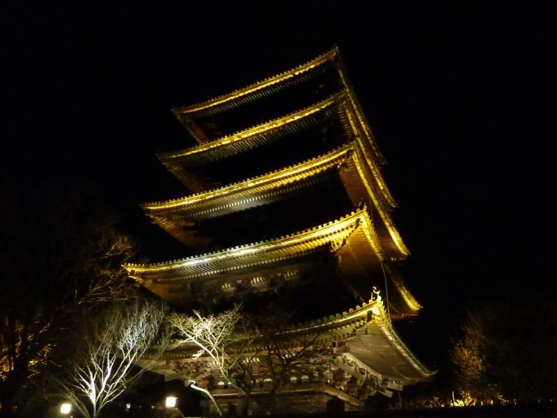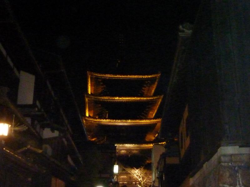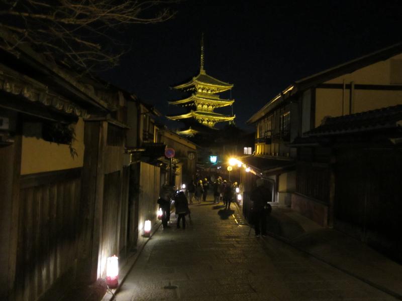 八坂神社を出て、提灯でほのかにライトアップされた下河原通を歩く。石塀小路もいい雰囲気だ。この先には高台寺があるので、また機会を作って来てみましょう。今日の目的地は清水寺、先へ進むと見えてきました八坂の塔。この辺りのランドマークとなっている五重塔だが、法観寺というお寺だったのですね。知らなかったです。ライトアップされていることもあり、三脚で写真を撮っている人もたくさんいる。法観寺は拝観時間が短いのだが、今日はたまたま無料拝観日でラッキー。下から見上げると、木造建築のすばらしさがよく分かります。八坂通を進む道すがら、振り返って八坂の塔を観ると本当に京都らしくていい景色だ。