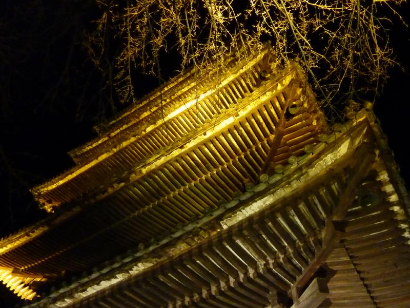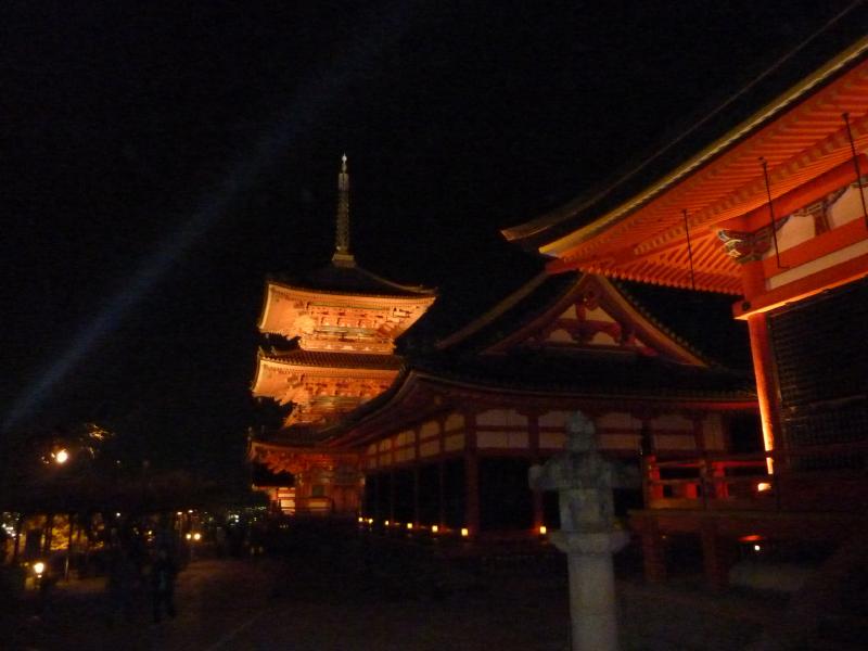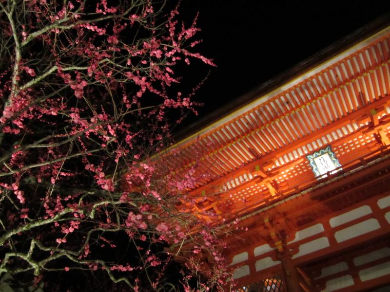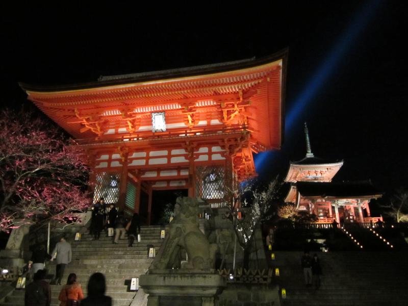 二年坂から上がってきた人波と合流し、産寧坂に向けて歩いて行く。道の両側にはいろんなお土産屋さんがあり、こんな時間でも賑わっている。桜の前で、時期的に人が少なくなる頃に行われる花灯路、うまく考えたものだ。産寧坂を上り、清水坂へ。ここを登り切ると、ようやく清水寺に到着だ。ここも久しぶりだなあ。仁王門・西門・三重塔がライトアップされたこの景色はなかなかの美しさ。さらに紅梅が加わり、季節感もあるのが実にいい。