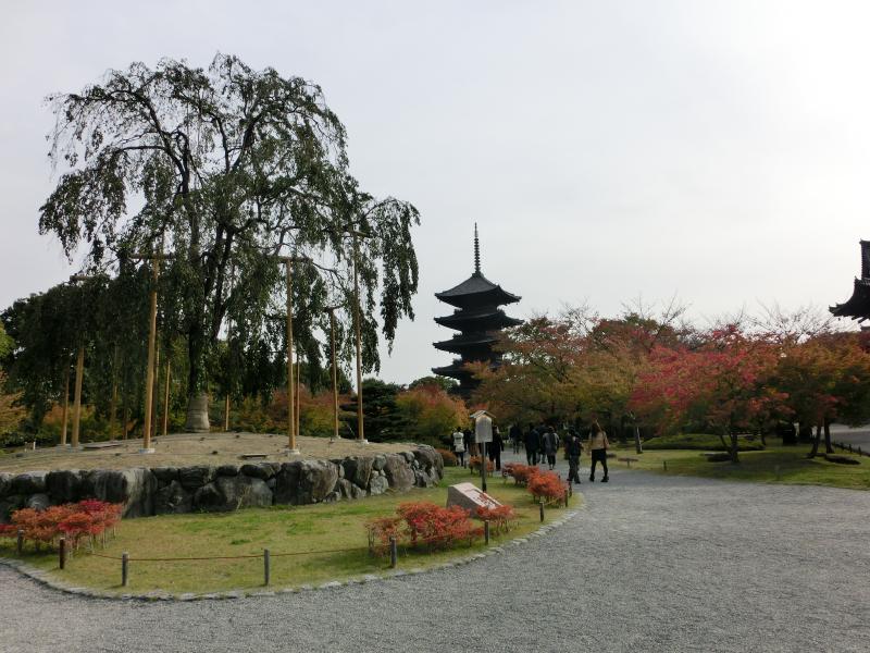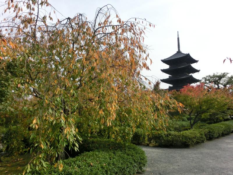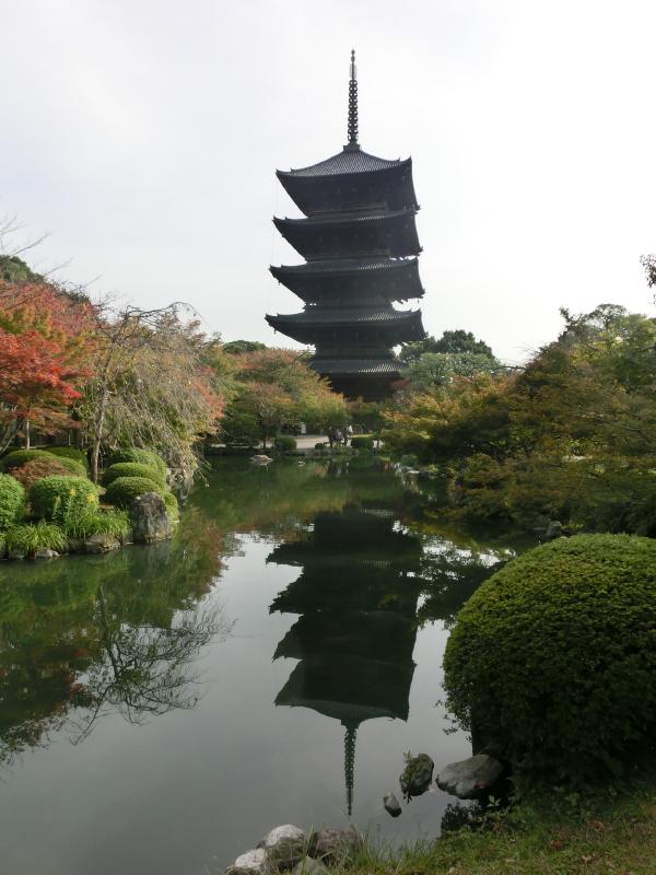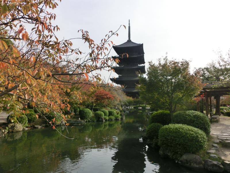 東寺は「教王護国寺」とも呼ばれるが、一般的にはやはり東寺の名前が使われているようだ。チケットを買って中に入ると、いきなり枝垂れ桜と五重塔のマッチアップが見えた。なんとも美しい景色だが、桜の頃にみたらもっと美しいのだろう。でも今日の何倍も観光客が増えるんだろうな。しばらくの間、紅葉が始まった木々と五重塔とのコントラストの美しさをゆったりと楽しむ。庭園の真ん中にあるのが瓢箪池。きれいな鯉がゆったり泳いでいるのがいい感じだが、さらにいいのは水面に映った五重塔。まさに「逆さ五重塔」の風情であり、赤やオレンジの葉っぱとの景色が実にいい。午前中だと、もっと青空だったかもしれないね。さて、いよいよ五重塔の近くまでやって来たぞ。いろんな角度からの写真を撮りましょう。