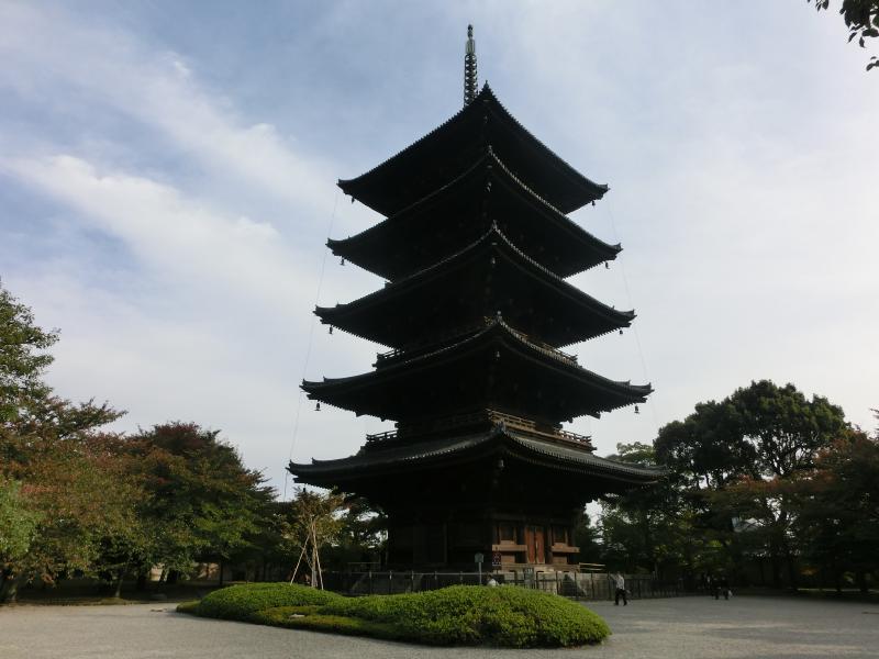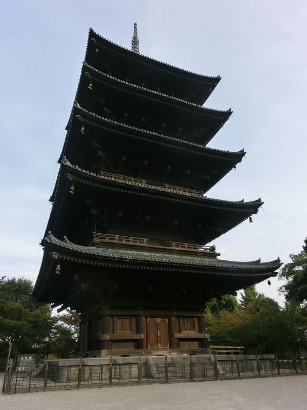 東寺の五重塔は、826年に弘法大師により創建が始まった。そしてその後落雷のために、なんと4回も焼失したらしい。今の塔は1644年、徳川家光の寄進によって竣工したもので、高さは55メートルもある。現存する日本の古塔の中では最古のものらしい。法隆寺の五重塔は31.5メートルなので、倍近い高さなんだね。ちょうど今の時期は秋は特別拝観で塔の中に入ることが出来る。一階部分だけだが、心柱を囲む四仏坐像(阿?如来、宝生如来、阿弥陀如来、不空成就如来)を拝むことが出来る。薄暗い中にある大きな如来像、それぞれの脇にある菩薩像、そして壁に書かれた人物などの絵が興味深い。階段があるが、当然上には行けないようになっている。でも一度上に登り、そこからの景色を見てみたいなあ。