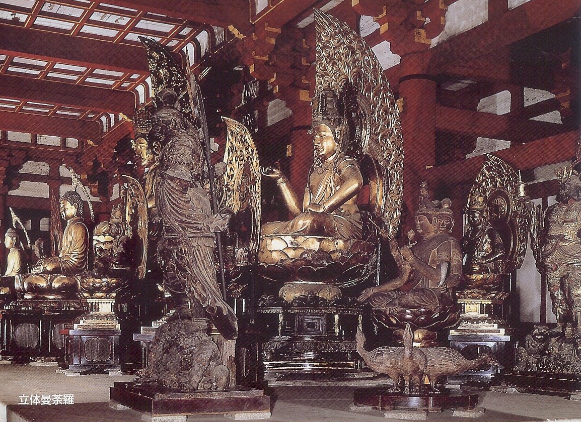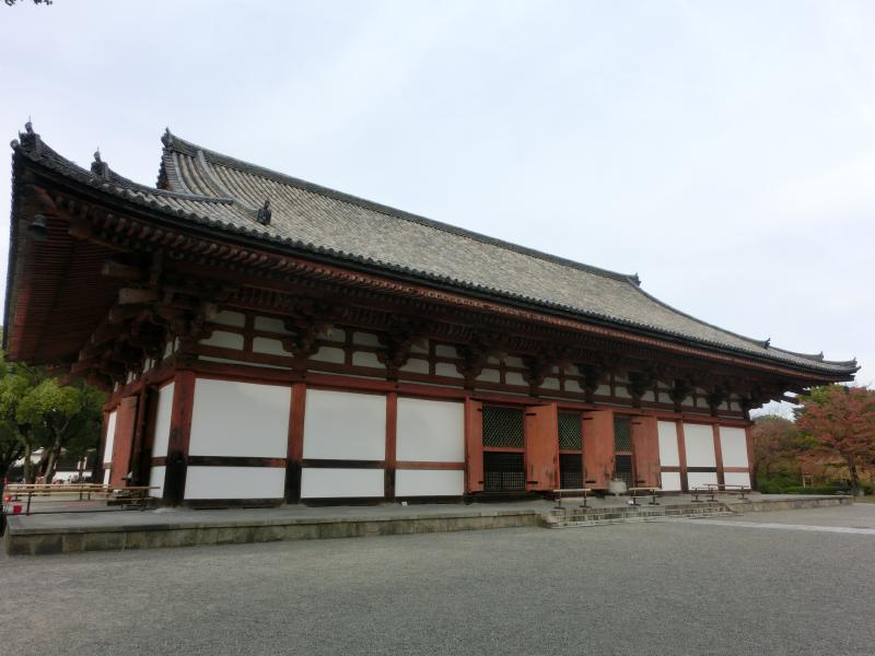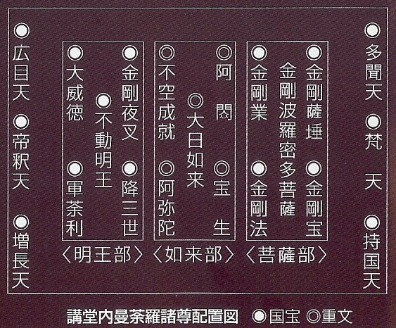 五重塔を出て、続いては金堂へ。ここは最も早く建設が始まったらしいが、今の金堂は1603年に豊臣秀頼の寄進により再建されたもの。この建物は一見二重に見えるが、中は天井の高い一重構造。広大な空間の中には、本尊の薬師如来と日光菩薩、月光菩薩の両脇侍像が安置されている。隣にあるのが講堂。ここは空海により825年に着工された。現在の講堂は1492年に再建されたものだ。この中は国宝や重要文化財の宝庫で、大日如来を中心とした五仏坐像や五大菩薩、五大明王など多数の仏像が安置されている。