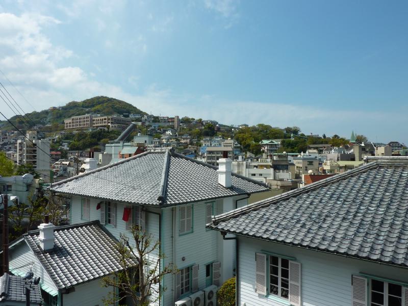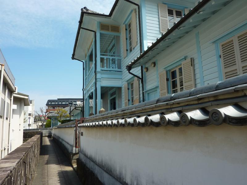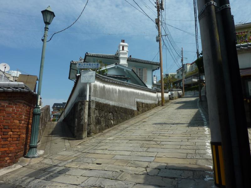 ホテルを出て、路面電車の思案橋駅へ。まずはオランダ坂方面へ向かうので、築町駅で乗り継ぎ券をいただき、石橋行きにのって市民病院前駅で下りる。ここから少し歩くと、オランダ坂に到着。かなり急な坂だ。このあたりは幕末から明治時代にかけて西洋人が住んでいた場所で、その名残ある建物が残っている。いわゆる異人館ですね。洋風の建物なのに瓦屋根というミスマッチが異国情緒を醸し出している。それにしてもかなり急な坂もあるなあ。