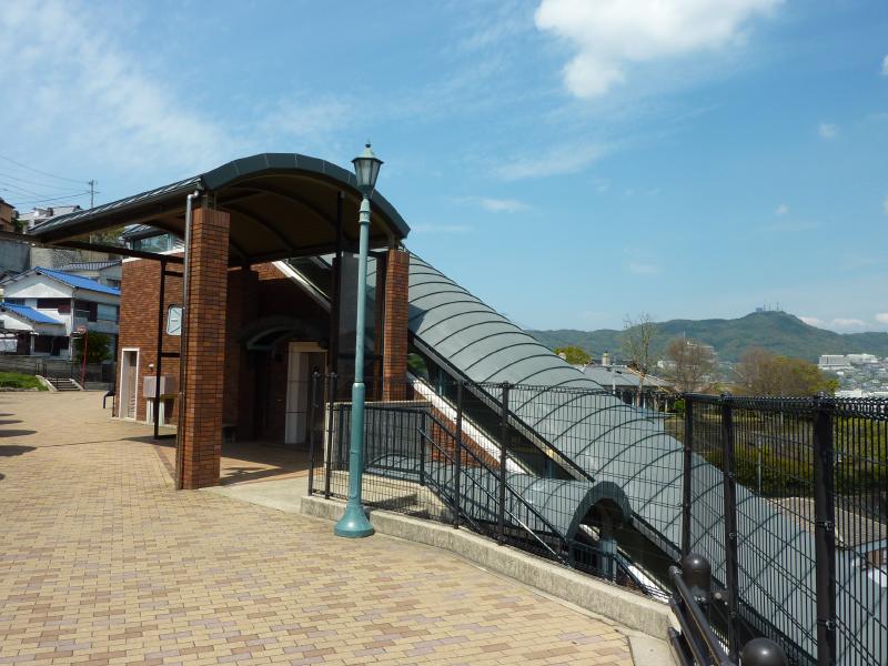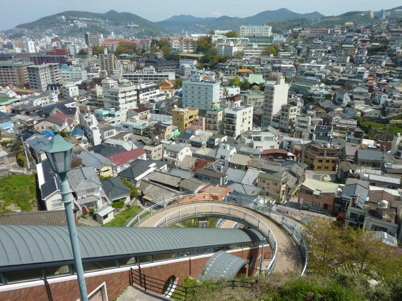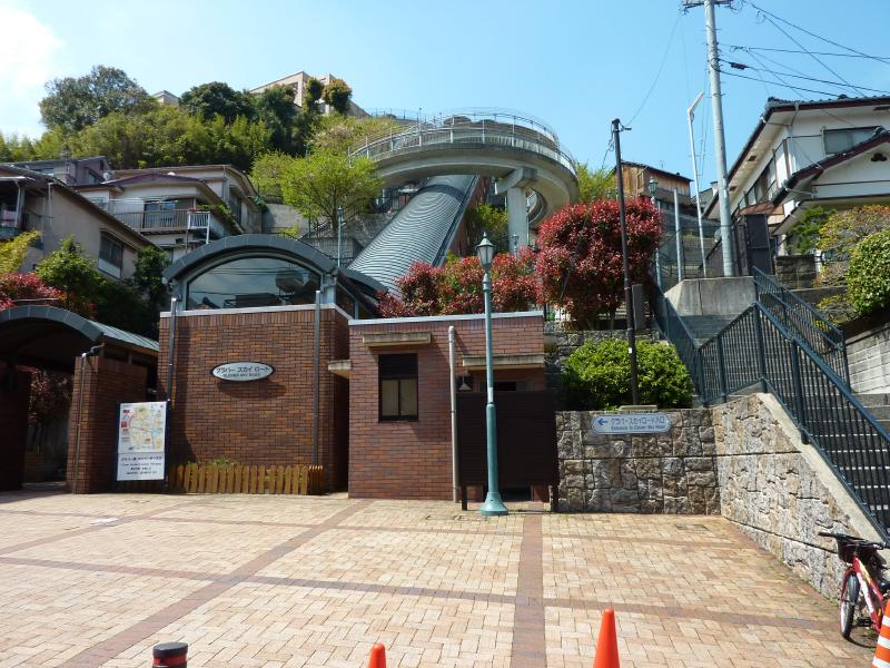 路面電車の終点駅までやって来たぞ。しばらく歩くと、グラバー園に続くスカイロードに到着。ここは急な坂道を斜めに上がっていくエレベーターで、グラバー園に向かう人だけでなく地元の人の足にもなっている。これがなかったら中腹辺りに住んでいる人は日々大変だろうなあ。無料だし、これはいい。あっという間に到着だ。