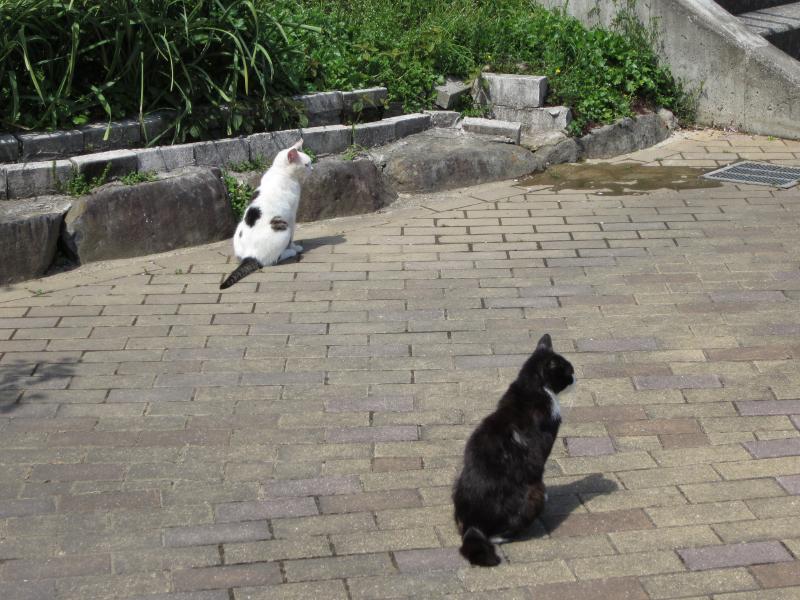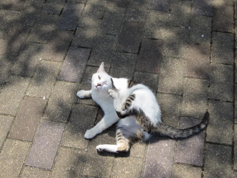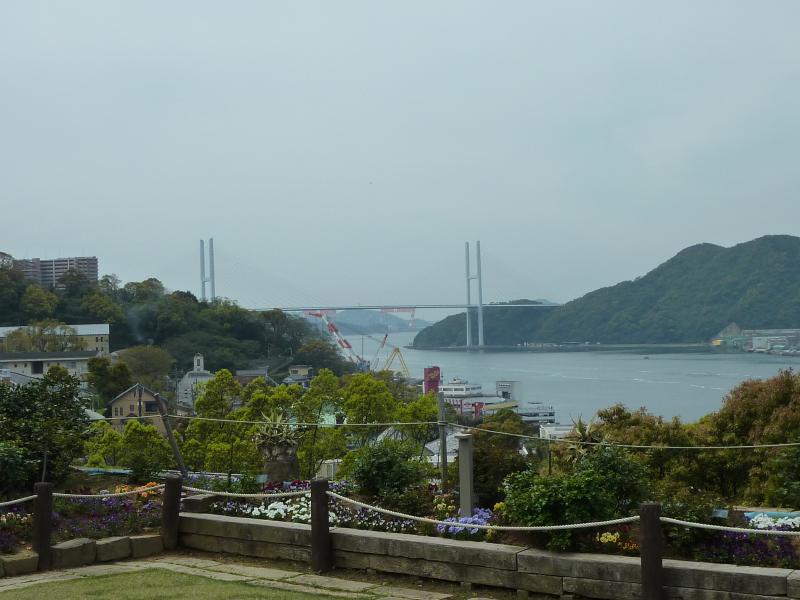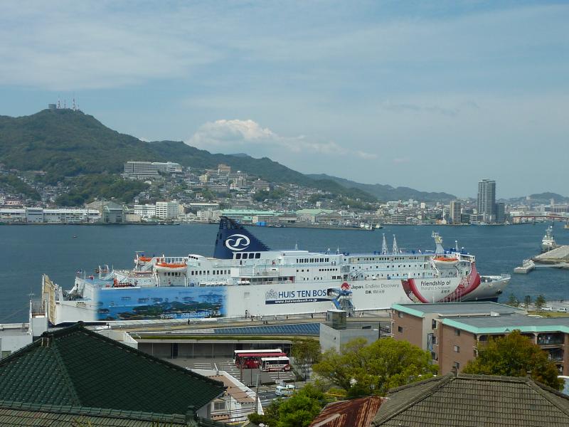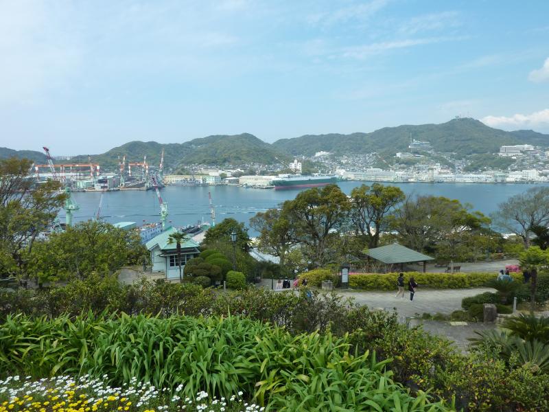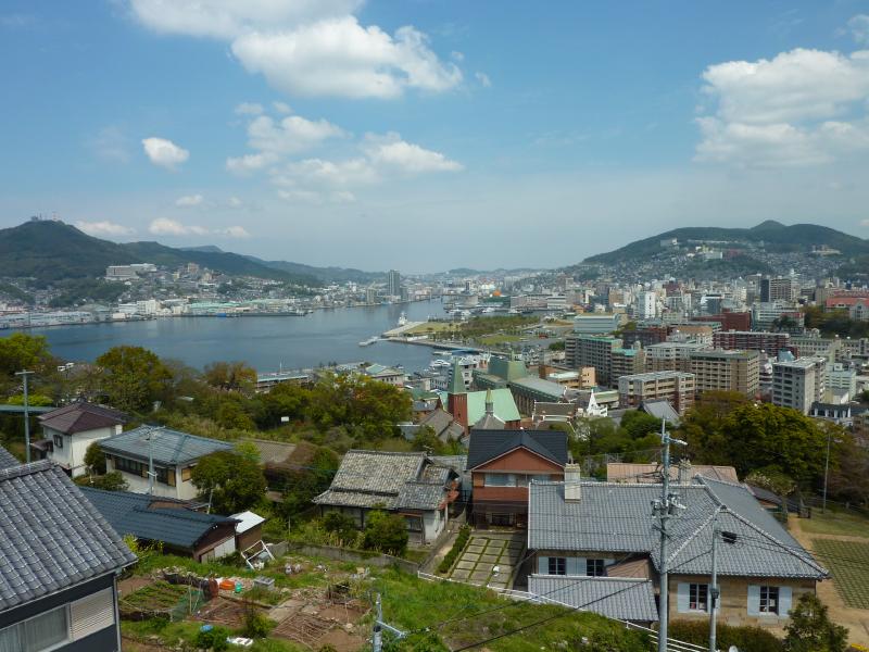 エレベータを降りて周りを見下ろすと、まさに坂の町・長崎を実感できる。ここはまだ中腹なので、このあとは普通のエレベーターでさらに上がっていくのだ。その途中、ベンチの周りにネコがたくさん集まっていました。そういえばいろんなところにネコがいて、シッポが短いのや丸いのがいたりするのだがこれは西洋人が持ち込んだネコとの混血が進んでいるかららしい。つまりネコまでも異国情緒満載ということだね。エレベータを上がると、港を一面に見ることができる。いい景色です。