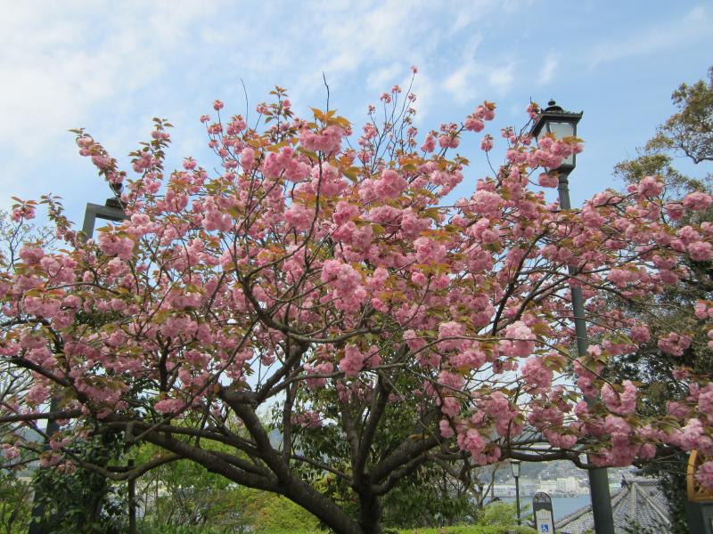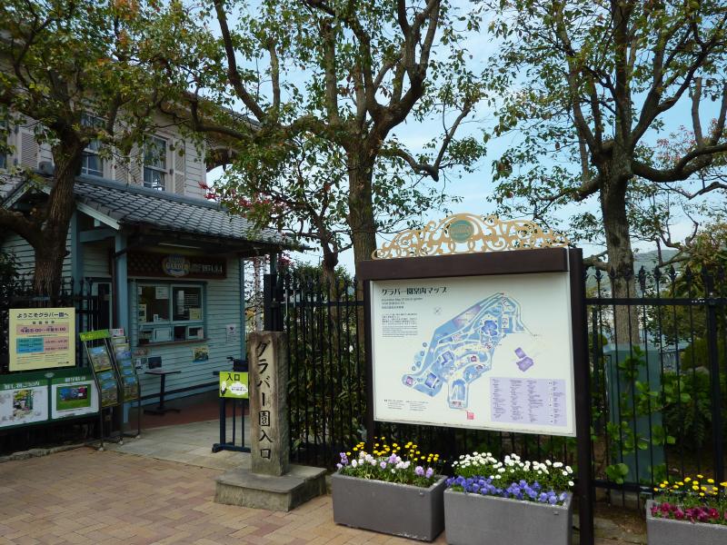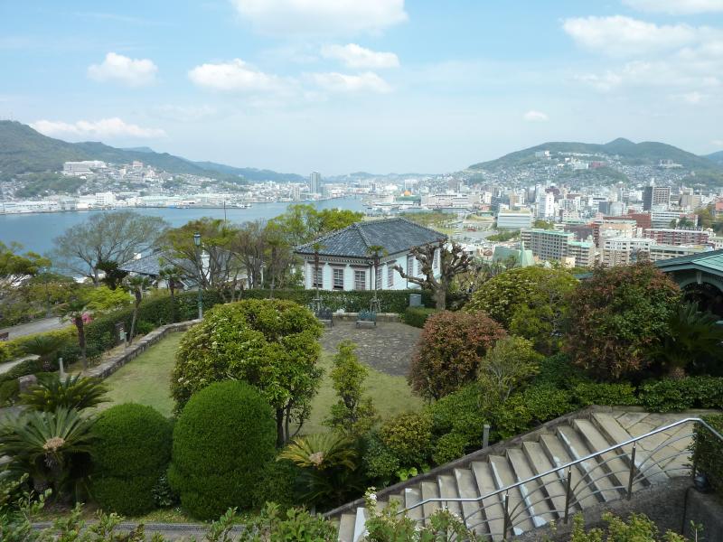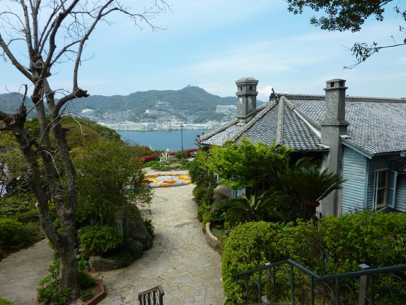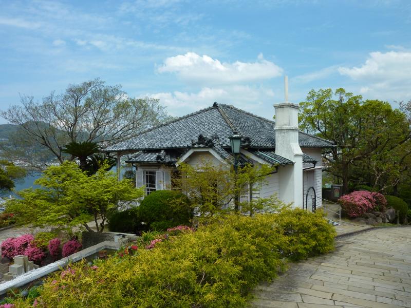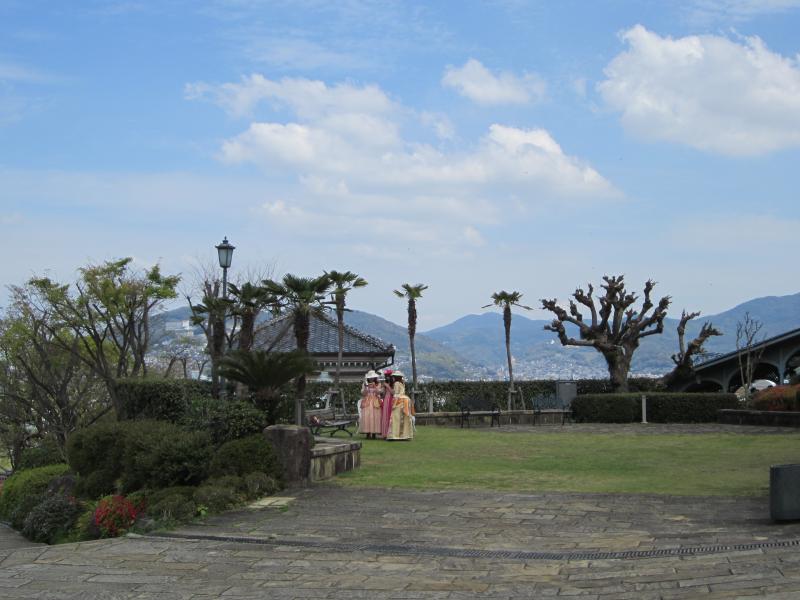 ここからはグラバー園の第2ゲートがすぐ近く。中に入ると、長崎港の眺めが飛び込んでくる。この展望広場からは、昨日行った稲佐山がよく見える。天気もいいし、いい景色だなあ。ゲート前にあるのが旧三菱第2ドックハウス。ここは船員達が宿泊するための場所だったらしく、長崎造船所そばにあったものを移築しているとのこと。ここからは、少しずつ下りながらまわっていこう。広場には、レトロなドレスに来た女子3人組が楽しそうだ。あれは園内で借りられる衣装だね。その近くにあるのが旧長崎高商の表門衛所。高校の守衛室、ということかな。