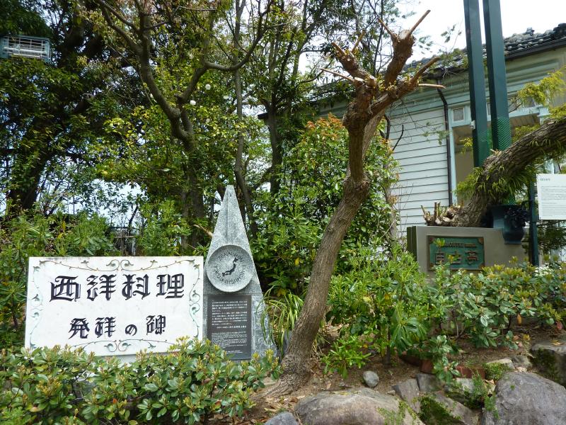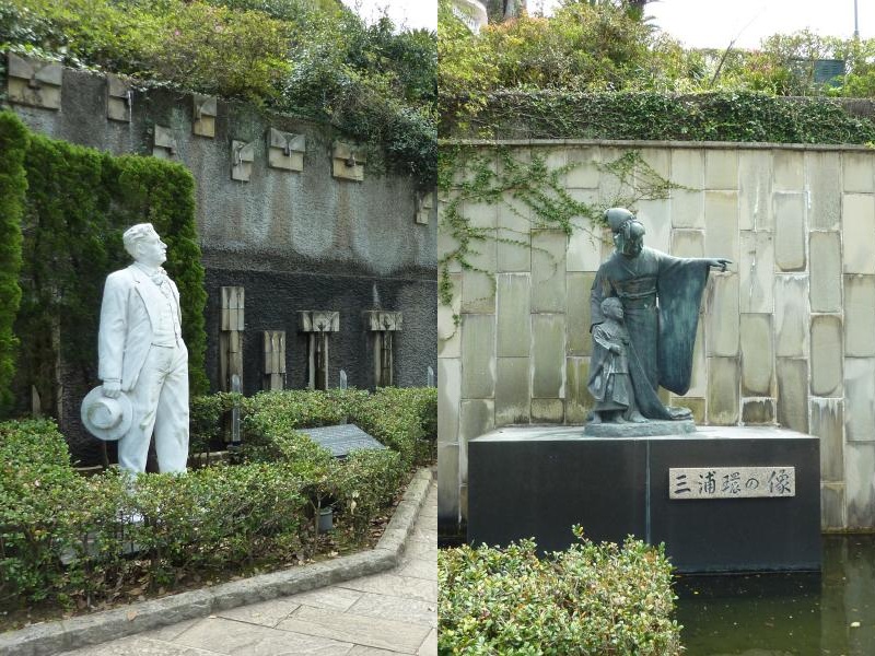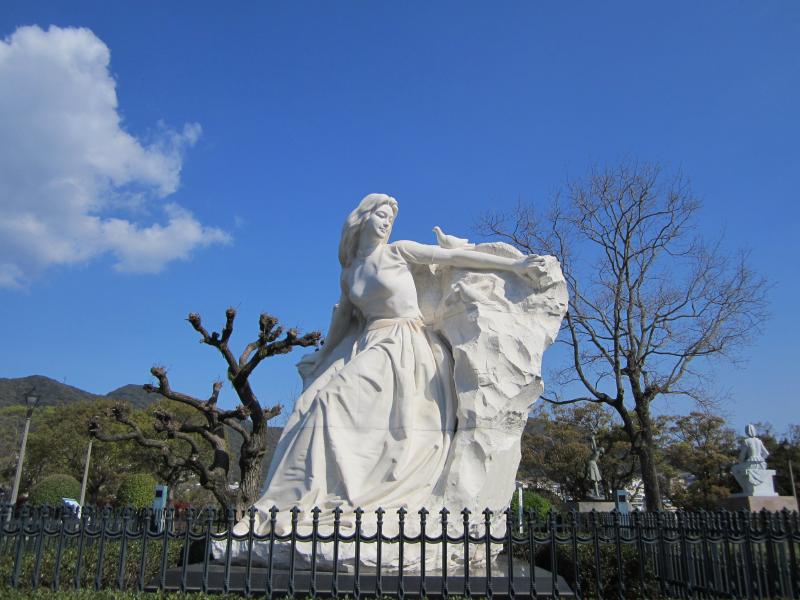 その先にあるのが旧自由亭。江戸時代の終わり頃、日本で初めての西洋料理のレストランとして伊良林にオープンされたとのこと。伊良林といえば亀山社中の近くだよね。ビーフステーキやカレー、コーヒーなどが振る舞われていたらしい。どんな人が通っていたんだろうね。その近くには泉があり、ここにはプッチーニと三浦環の像がある。長崎を舞台にしたドラマ、蝶々夫人(マダム・バタフライ)の作曲者とそれを演じた人ですね。