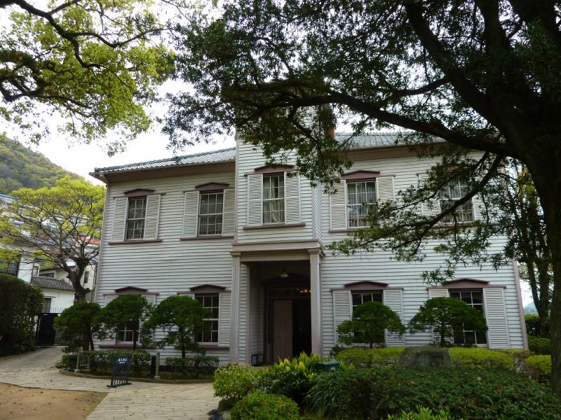 下り坂の途中にあるのが旧ウォーカー住宅。イギリス人実業家のロバート・ネール・ウォーカーの次男が住んでいた住宅で、大浦天主堂のそばに建っていたらしい。そのウォーカーとは、日本の海運業に業績を残し、さらにキリンビールの前身であるジャパン・ブルワリ・カンパニーを創立したとのこと。ありがとう、ウォーカーさん。その向かいにあるのが旧長崎地方裁判所長官舎。ここは今ではさっきのレトロ衣装を貸し出す場所になっていました。