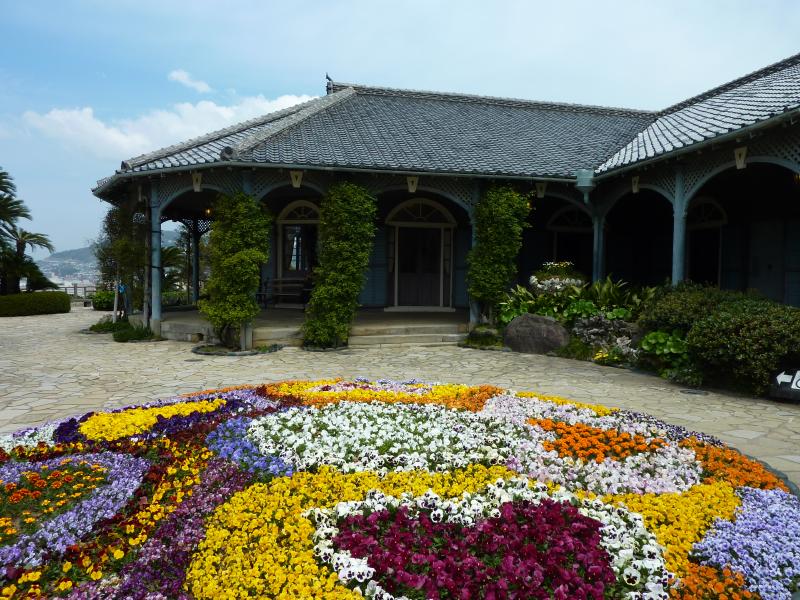 そして最後にグラバー住宅。日本最古の木造西洋風建築だ。建物前の花壇が満開できれいだ。中に入ると、ひときわ広い部屋の中にはたくさんの家具があり、当時の様子がしのばれる。住宅内にはトーマス・ブレーク・グラバーとその妻ツルの写真、その息子の倉場冨三郎の銅像などがある。建物の天井には隠し部屋があり、ここは幕末の志士をかくまったこともあったらしい。奥には厨房があり、ここでどんな料理が作られていたのかな。外に出ると、グラバー氏の銅像がありました。どんな思いで日本に来て、どんな思いで日本の発展を見ていたのかな。