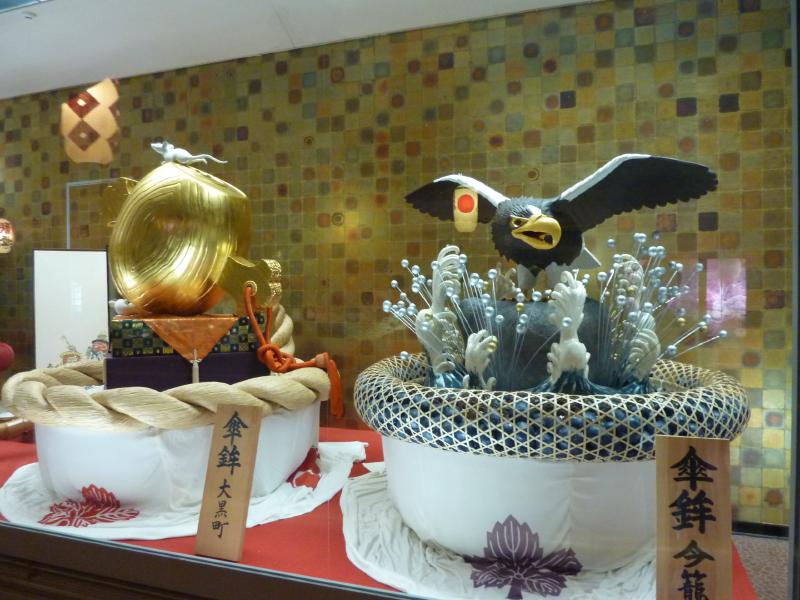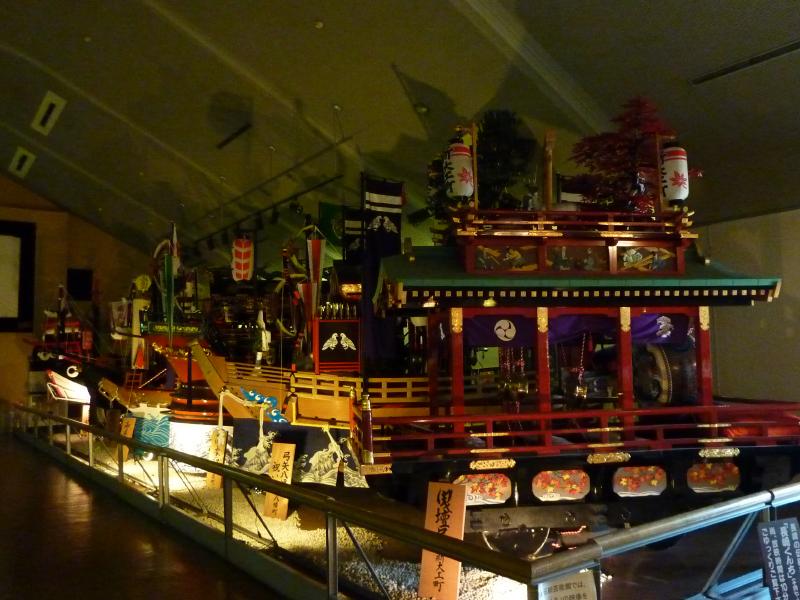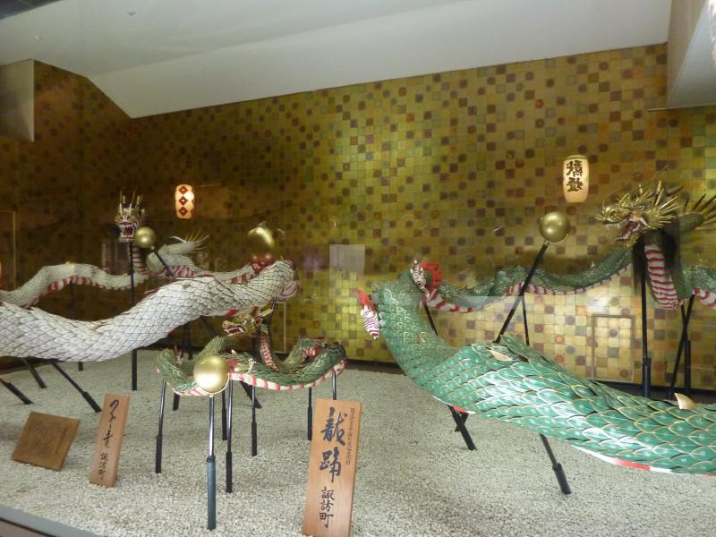 さて、これで一通りまわったぞ。では行きますか。出口の建物が長崎伝統芸能館になっていて、中には長崎のお祭り「長崎くんち」に関する展示がされていた。傘鉾と呼ばれるたくさんの山車や龍踊りの白龍と青龍などが展示されていました。ポルトガルやオランダ、中国などの文化がミックスされた祭りで、その日は長崎市内が大盛り上がりになるようだ。楽しそうだなあ。