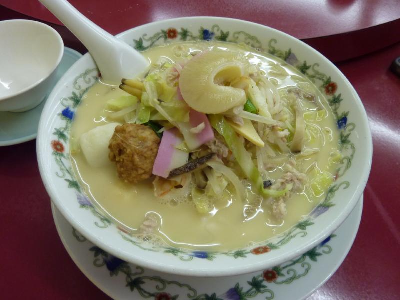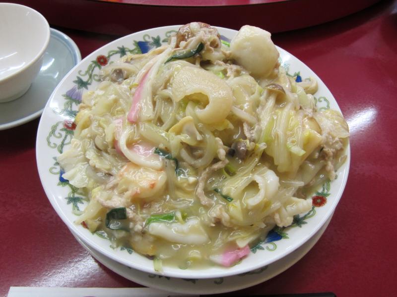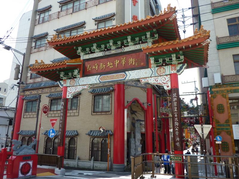 さあて、お昼ごはんだ。路面電車で築町まで行き、少し歩くと川沿いにいかにも中華街な門があった。ここは長崎新町中華街、このあたりに中華のお店がたくさん集まっている。さて、何にしようかな。やっぱりもう一回、ちゃんぽん食べてみようかな。さほど情報があるわけではないので、通りをうろうろして目についた江山楼というお店に入ってみようか。2階に通されたところ、広い畳の部屋に中華の丸テーブルが並んでいてなかなかおもしろい。メニューはいろいろあるが、特製のちゃんぽんと皿うどんをいただきましょう。しばらくして運ばれてきたものは、なんとも大盛り。具も麺もたっぷりだ。ちゃんぽんは昨日食べたのよりもあっさり目かな。野菜がたっぷりで、フカヒレなど海鮮もいろいろ入っていてうまいです。皿うどんはパリパリの麺がしなっとなってうまいが、麺が多すぎて食べ切れず。いやいや、満腹です。ごちそうさまでした。