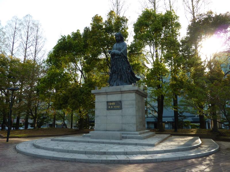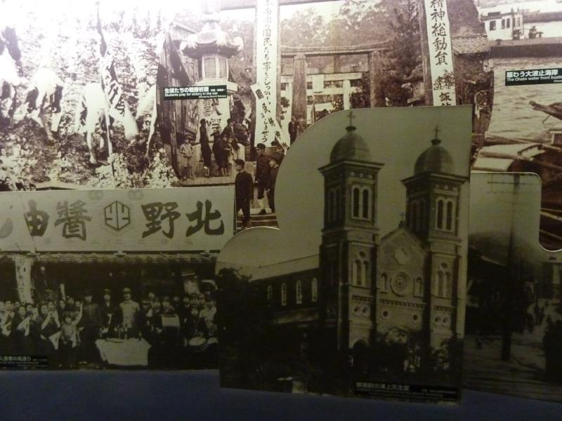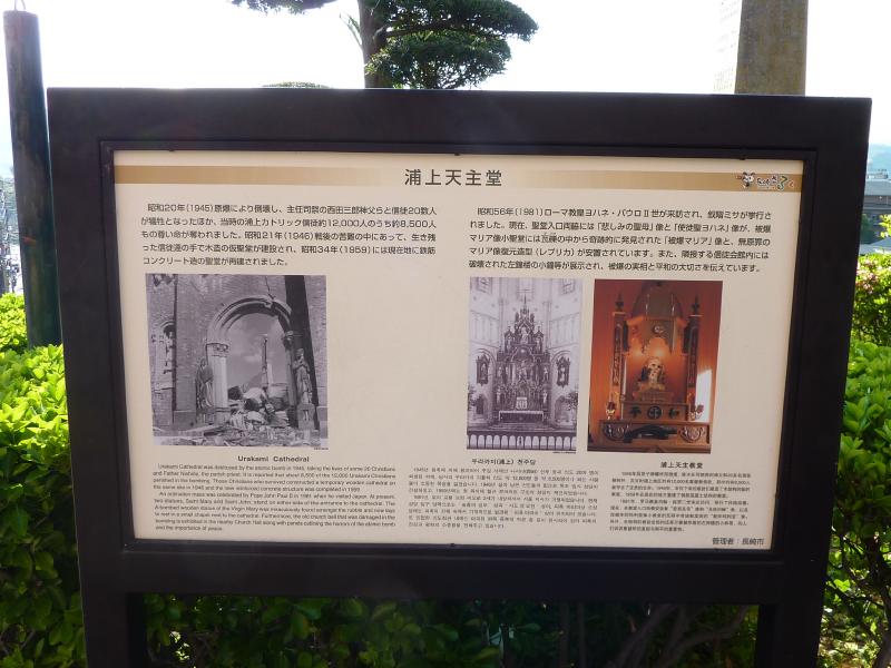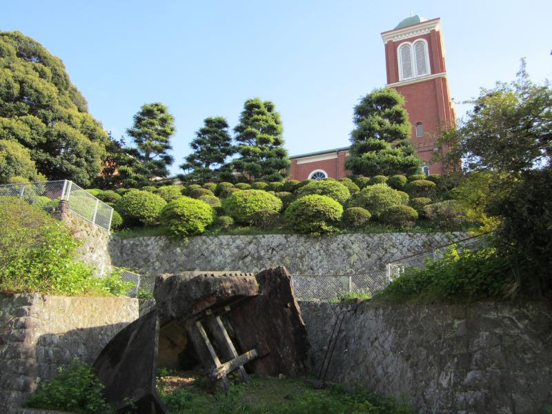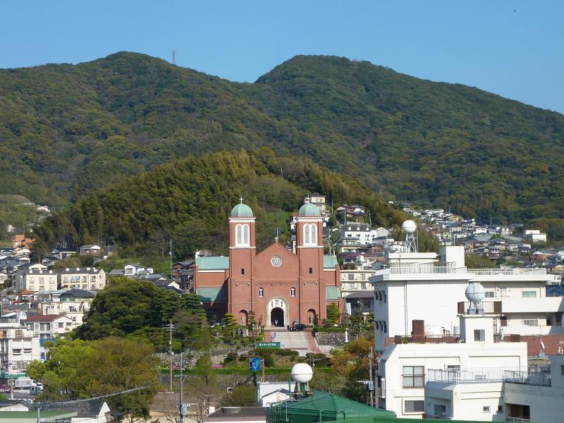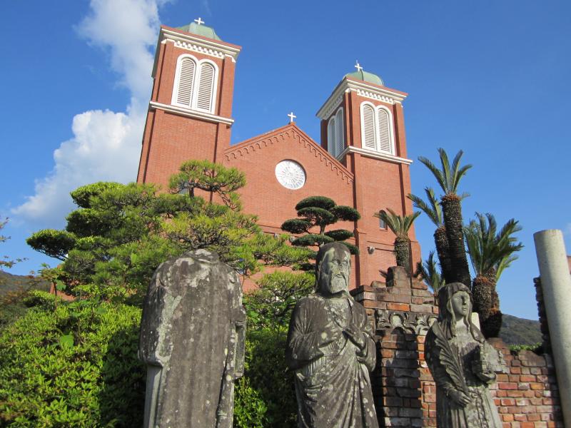 平和公園を出ると、すぐに浦上天主堂が見えた。長い階段を下り、坂道を進むと天主堂の下に到着。ここは爆心地に近いために倒壊したのだが、当時の鐘楼がそのままの状態で展示されている。原爆ドームと同様に、ここも保存しようという動きもあったらしいが、あまりの破壊にひどさに昭和34年に再建されたとのこと。今ではレンガ造りの外壁が美しい。中は撮影禁止だが、被爆したマリア像が展示されていて当時の様子を物語っている。ちょうど訪れたときは、ミサが行われていました。
