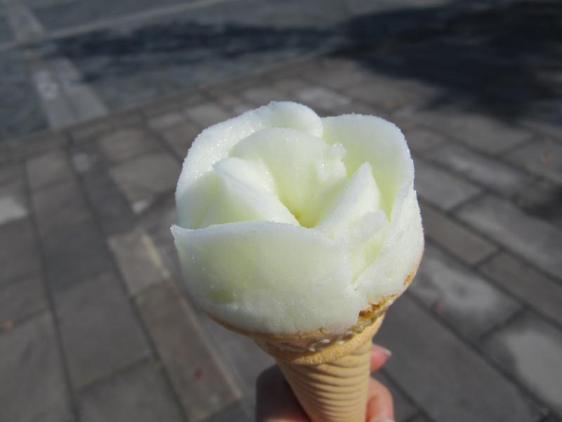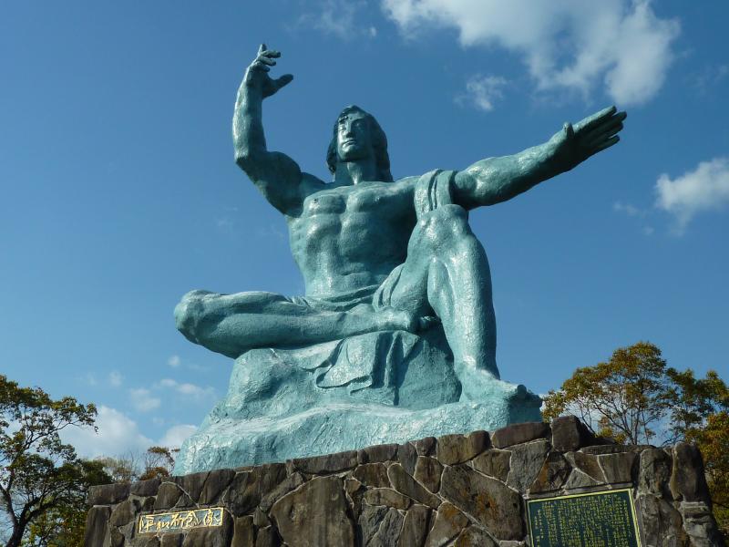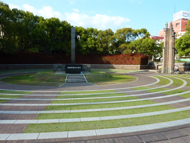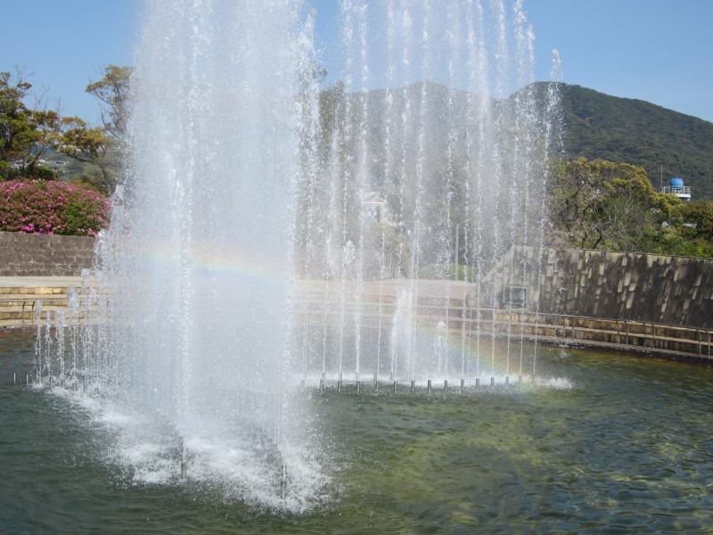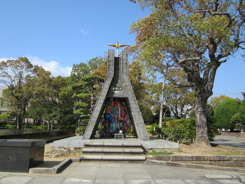 資料館を出て、坂道を下がり道なりに進むと丘があり、その上にあるのが平和公園。ここは昭和26年に作られた公園で、原爆の悲惨さと平和の大切さを訴えている。公園の奥にあるのが平和祈念像で、右手は原爆の驚異を、左手は平和を表現している。青空の中、今はこんなに穏やかなこの瞬間だが、こうして平和にいられることに感謝です。修学旅行で来たときには何を感じていたかな・・・さーちゃんはのんびりと長崎名物のチリンチリンアイスを楽しんでました。