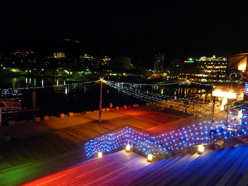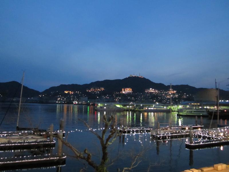 出島駅で下り、海側に歩くと出島ワーフがある。実際の出島は今は跡形も無く、もう少し陸側にあったとのこと。埋め立てが進んでしまったと言うことで、なんだかもったいないなあ。なんとか形を残せなかったのかな。出島ワーフにはカフェやレストランなどが並んでいて、海を見ながら寛ぐことができる。しばらく散歩したり、2階のベンチでゆったりしたりしながらのんびり過ごす。途中近くのお店に行ったりしているうちに、日が沈んできたぞ。海の向こうに見える稲佐山にも、灯りがともった。穏やかな、いい雰囲気ですね。お腹も空いてきたし、そろそろ行きますか。
