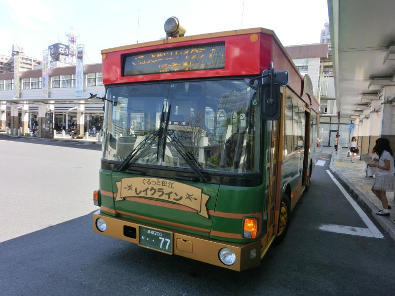 とはいえ快調にバスは走り、予定通り12時に松江駅に到着。バスを降りると、いきなり目の前にある竹島関係のスローガンが印象的。ここ松江はあの園山俊二の出身地らしく、駅前には懐かしのギャートルズの像がありました。駅から歩いて数分ほどにある松江東急インが今日の宿。まだ時間が少し早いので、荷物を預かってもらって出かけますか。松江市内はレイクラインというバスが観光に便利なので、松江駅から乗りましょう。少しレトロな感じのバスがいい感じ。市内を走っていくのだが、途中川が見えたり堀が見えたり、水が身近にある町だと感じた。