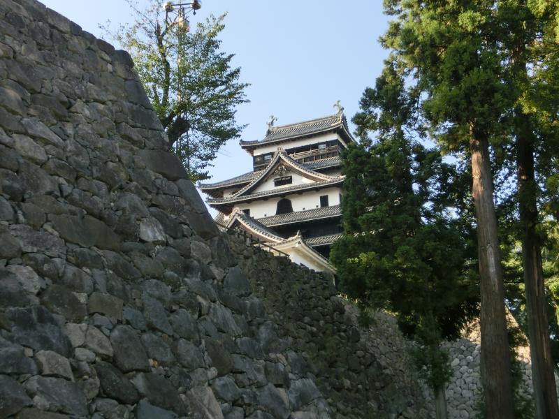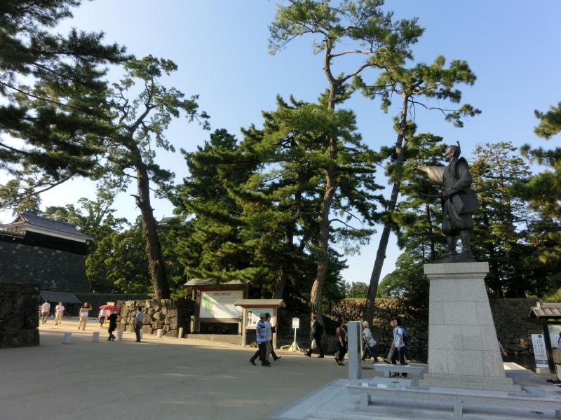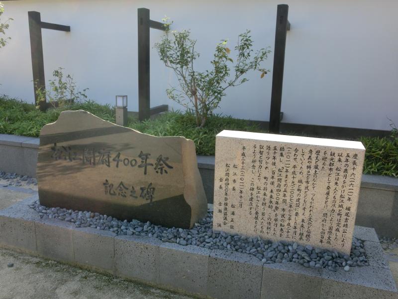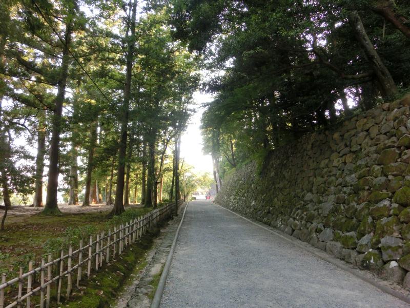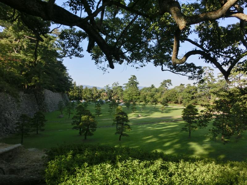 さて、では松江城への向かいますか。堀にかかる橋を渡り、城の中へ入る。ここ松江城は関ヶ原の戦いの後に出雲を与えられた堀尾吉晴が築城したとのこと。このあたりのお城ってだいたい400年記念なんだね。高い石垣沿いの坂道を、天守閣を見上げながら、美しい緑を見下ろしながら、ゆったりと歩いて行く。中に入る時間はないのでここまでだが、やっぱり日本の城はいい。